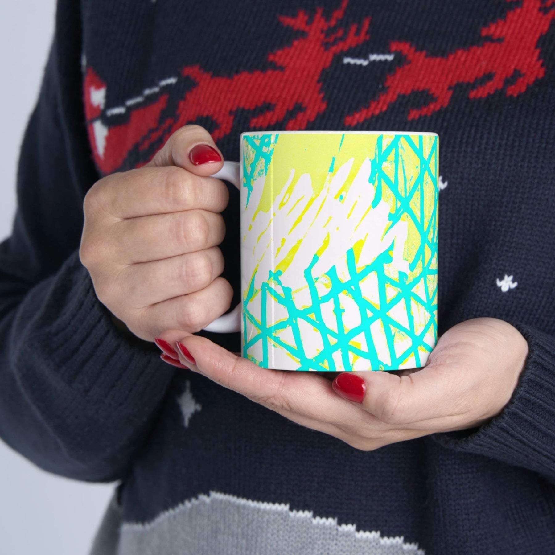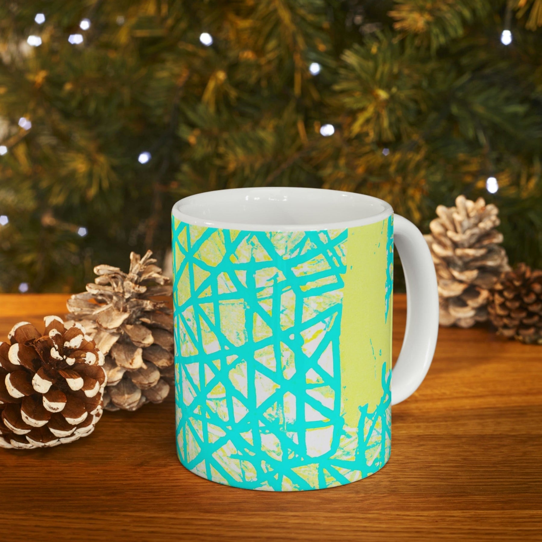 Cyan Blue Lime Green And White Pattern. Warm-up with a nice cuppa out of this customized ceramic coffee mug. Personalize it with cool designs, photos or logos to make that "aaahhh!" moment even better. It’s BPA and Lead-free, microwave & dishwasher-safe, and made of white, durable ceramic in 11-ounce size. Thanks to the advanced printing tech, your designs come to life with incredibly vivid colors – the perfect gift for coffee, tea, and chocolate lovers.