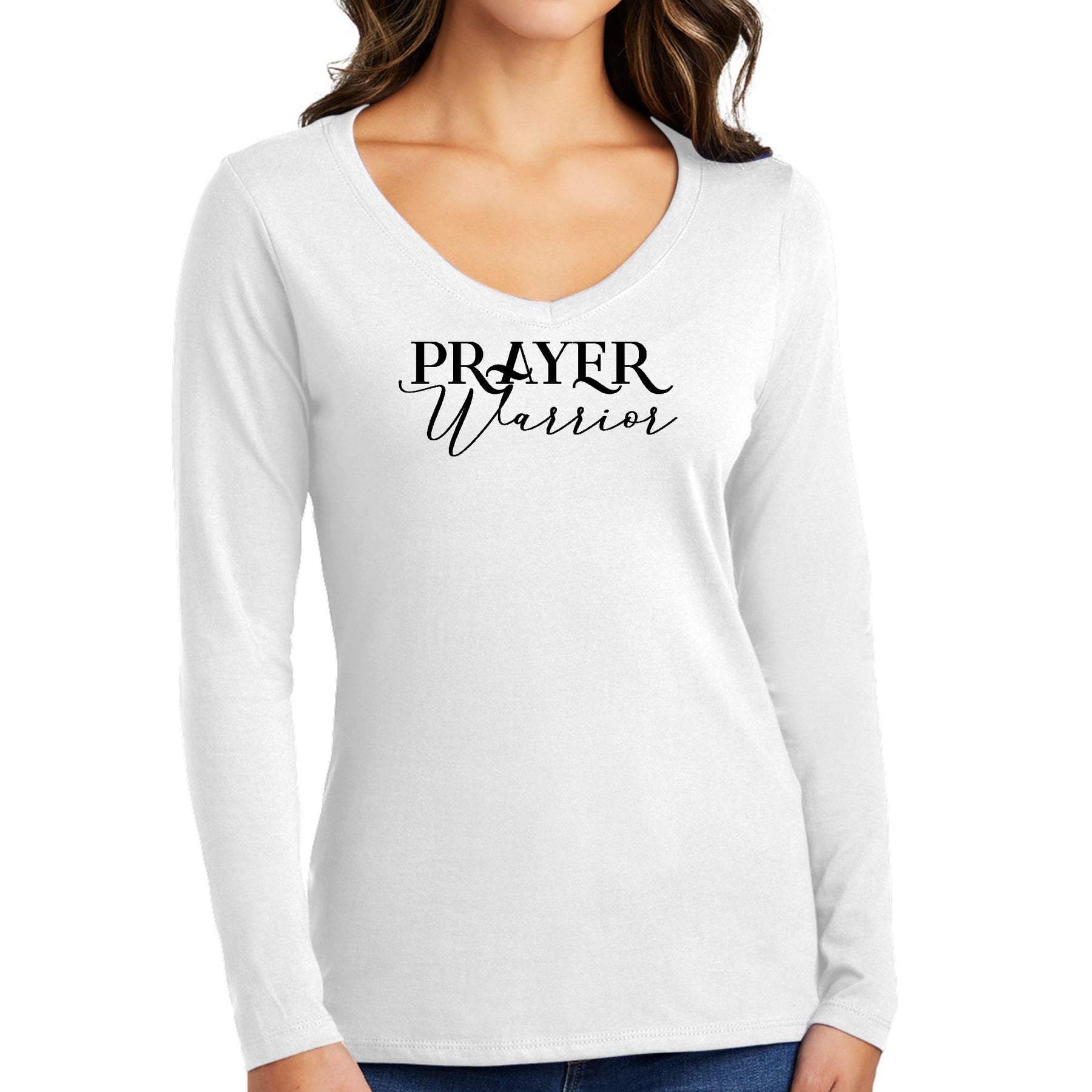 Womens Long Sleeve V-Neck Graphic T-Shirt, Prayer Warrior Script Style Illustration Black. Discover the versatility and style of our Long Sleeve Cotton T-Shirt. This unisex long sleeve t-shirt is designed to be a go-to choice in all seasons, whether it's the perfect fall shirt, a stylish option for spring, or a cozy companion in winter. Crafted from breathable cotton, it combines comfort and fashion effortlessly. Embrace the ultimate fusion of comfort and style with our unisex long sleeve t-shirts, and make a statement.