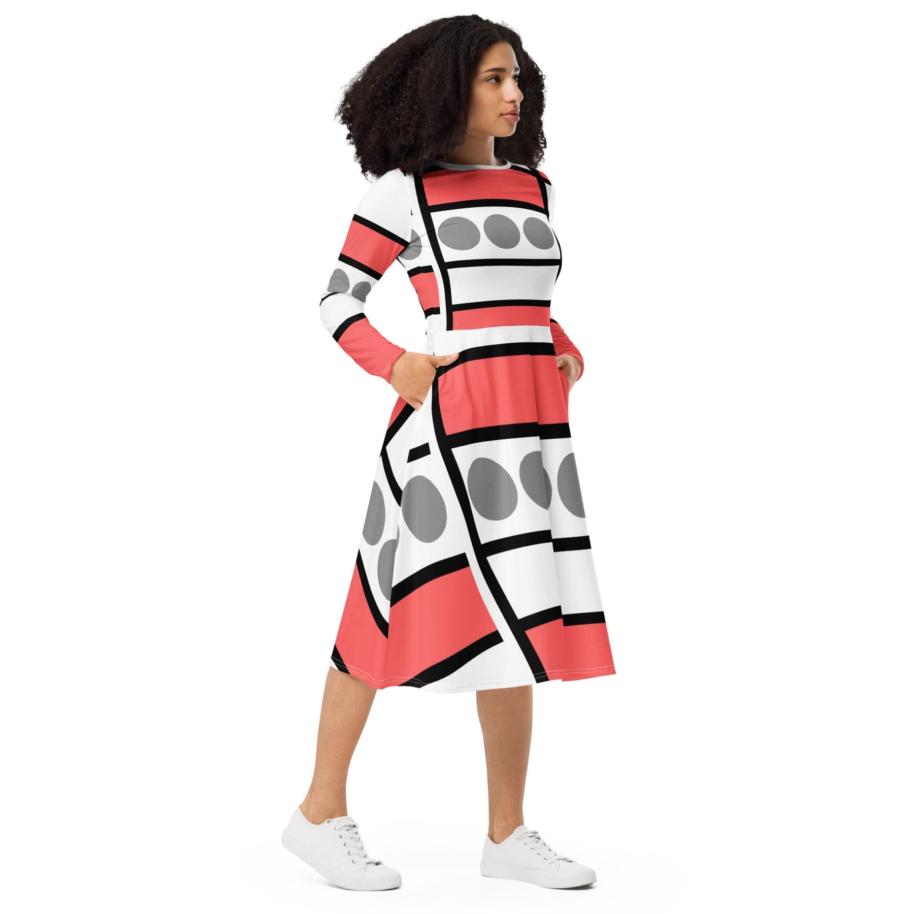 Womens Long Sleeve Midi Dress, Pale Red Print. Meet your new favorite dress! Its soft fabric and flattering cut will ensure you feel comfortable and feminine all day long. Plus, the fitted waist and flared bottom part of the dress will accentuate the wearer’s naturally beautiful silhouette. The best part about the dress? It. Has. Pockets.