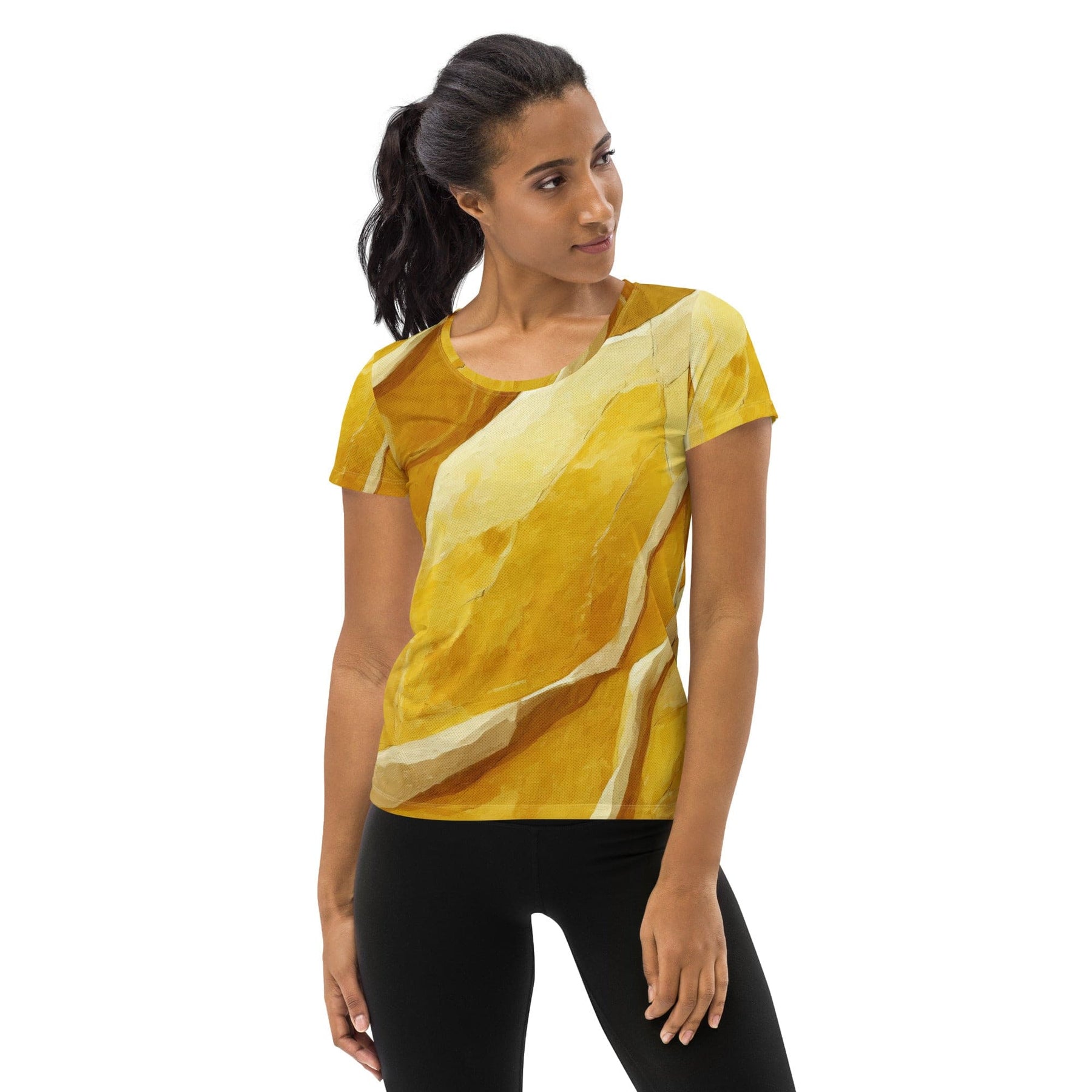 Womens Stretch Fit Athletic Sports T-Shirt, Rustic Yellow Stone Print. Our Women's Stretch Fit Athletic Sports T-shirt is engineered to enhance your performance and comfort during workouts. Crafted from premium stretch fabric, this t-shirt offers a form-fitting yet flexible fit that moves with your body, allowing for unrestricted movement. The moisture-wicking properties of the fabric keep you dry and comfortable, even during the most intense exercise sessions. Designed with an athletic silhouette, featuring a crew neckline and short sleeves, this t-shirt provides a classic and versatile look suitable for any activity. Whether you're hitting the gym, going for a run, or participating in sports, this t-shirt is your ultimate choice for optimal performance and style.