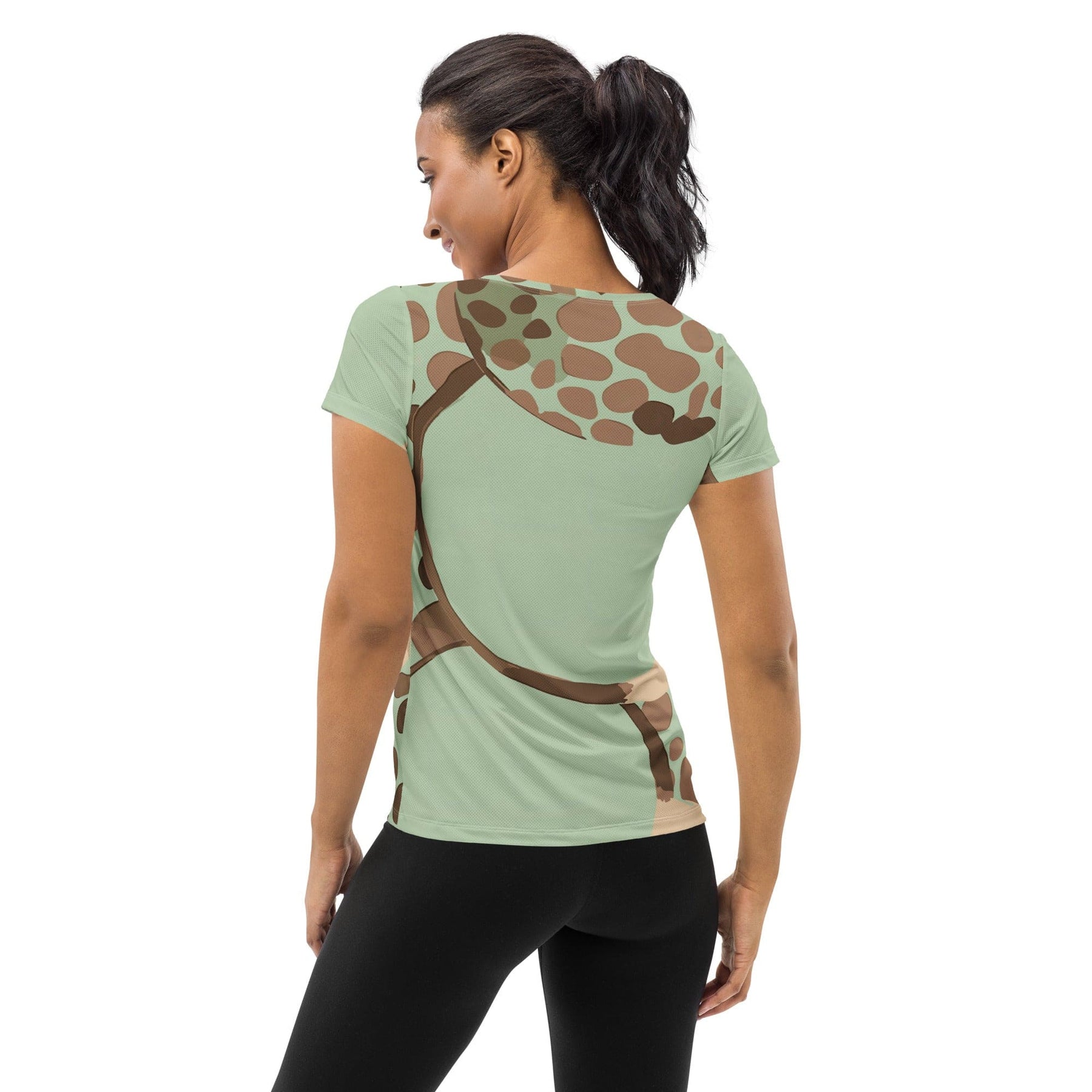 Womens Stretch Fit Athletic Sports T-Shirt, Green Beige Spotted Print. Our Women's Stretch Fit Athletic Sports T-shirt is engineered to enhance your performance and comfort during workouts. Crafted from premium stretch fabric, this t-shirt offers a form-fitting yet flexible fit that moves with your body, allowing for unrestricted movement. The moisture-wicking properties of the fabric keep you dry and comfortable, even during the most intense exercise sessions. Designed with an athletic silhouette, featuring a crew neckline and short sleeves, this t-shirt provides a classic and versatile look suitable for any activity. Whether you're hitting the gym, going for a run, or participating in sports, this t-shirt is your ultimate choice for optimal performance and style.