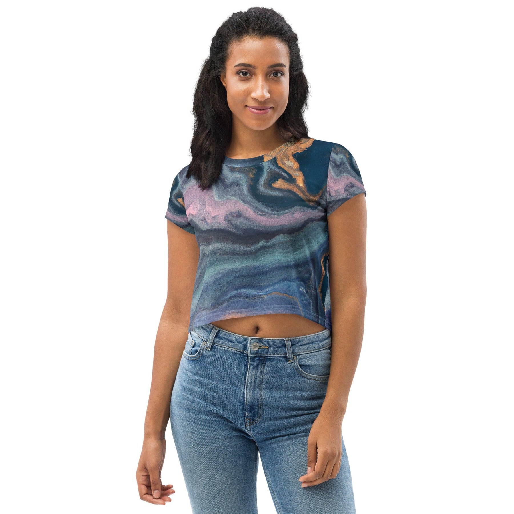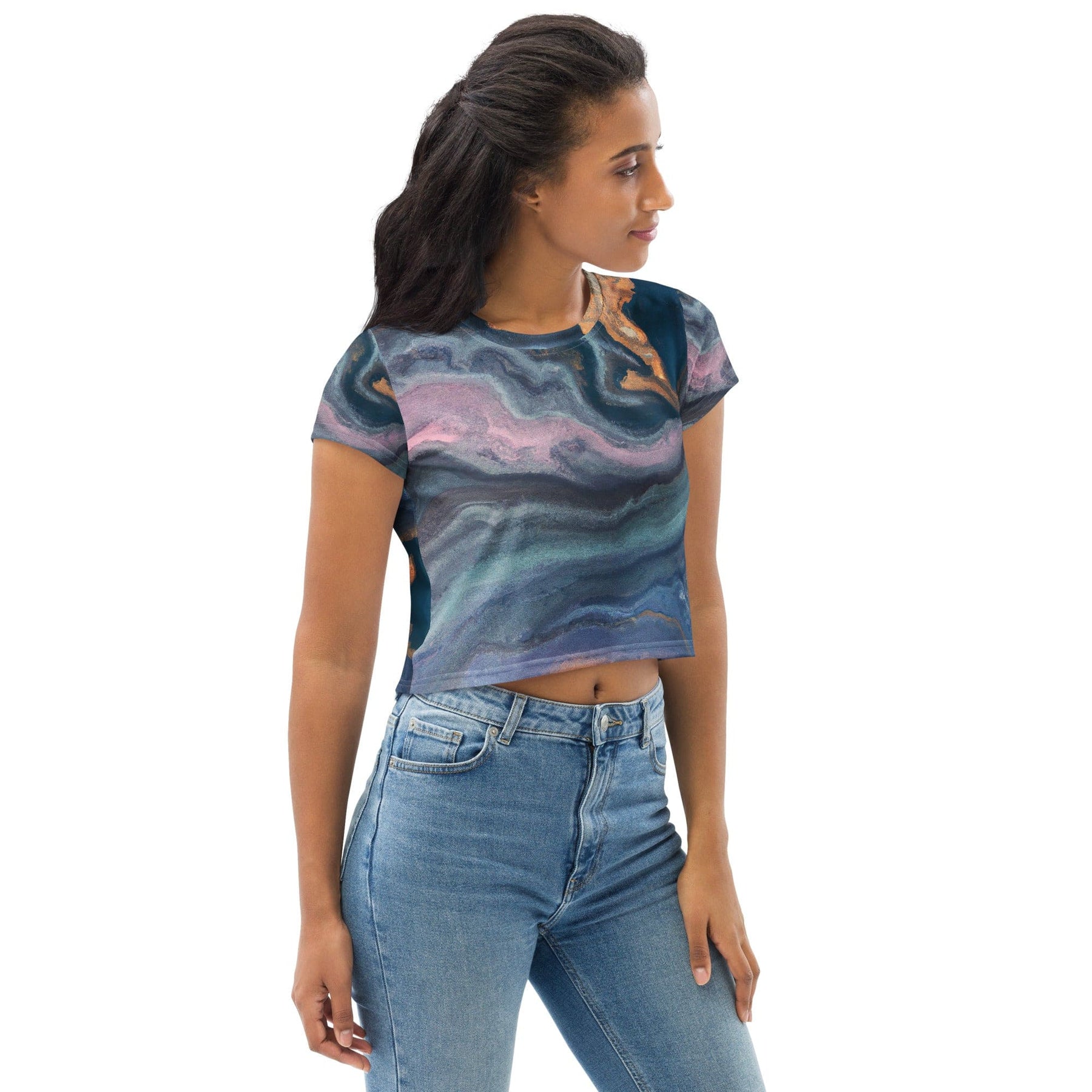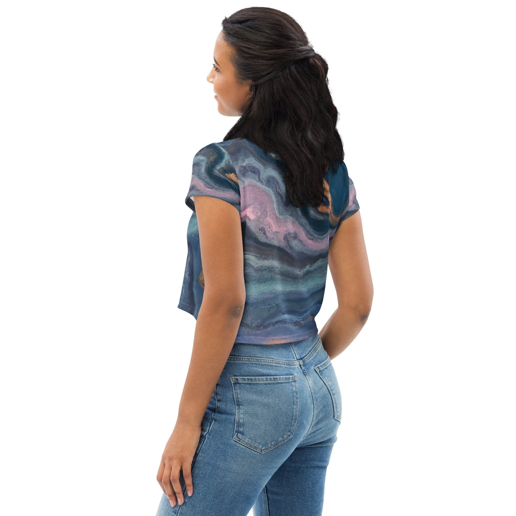Womens Stretch Fit Crop Tee, Blue Pink Marble Swirl Print. Our women's crop tee jersey offers a delightful blend of comfort and style, perfect for any casual occasion. Crafted from soft, breathable fabric, this chic top features a cropped silhouette that pairs effortlessly with high-waisted bottoms for a trendy look. The crew neckline and short sleeves enhance its laid-back appeal, making it an ideal choice for workouts, outings, or lounging at home. This versatile piece is a must-have addition to your wardrobe, ensuring you stay fashionable and comfortable all day long.