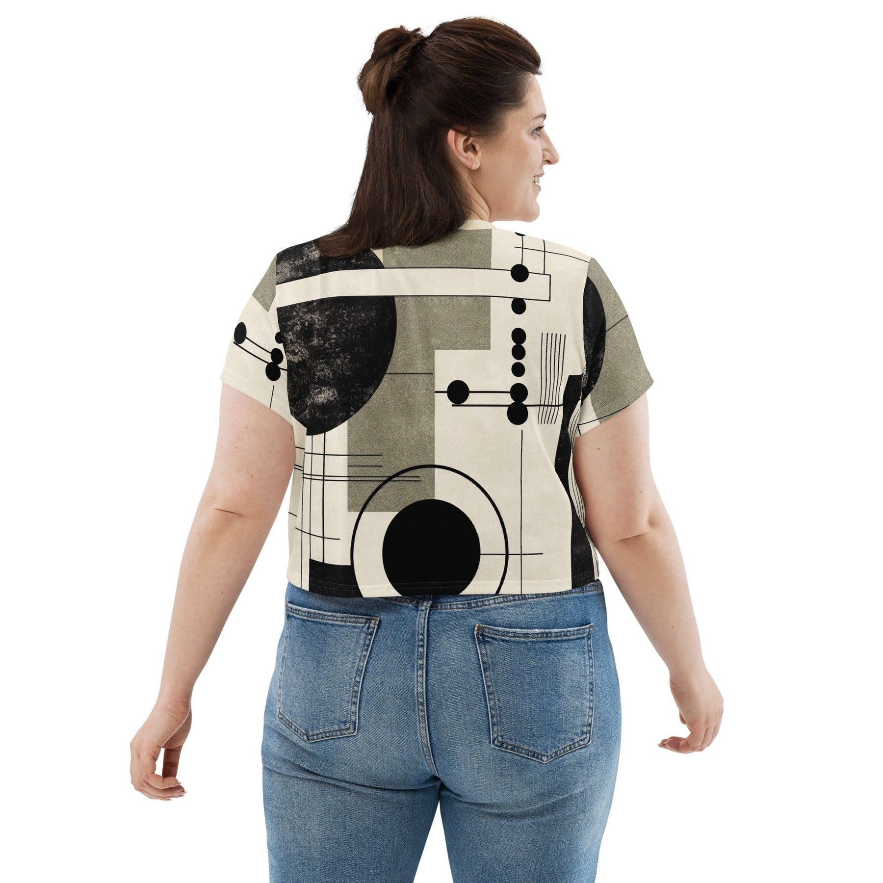 Womens Stretch Fit Crop Tee Jersey, Abstract Black Beige Brown Geometric Shapes. Our women's crop tee jersey offers a delightful blend of comfort and style, perfect for any casual occasion. Crafted from soft, breathable fabric, this chic top features a cropped silhouette that pairs effortlessly with high-waisted bottoms for a trendy look. The crew neckline and short sleeves enhance its laid-back appeal, making it an ideal choice for workouts, outings, or lounging at home. This versatile piece is a must-have addition to your wardrobe, ensuring you stay fashionable and comfortable all day long.
