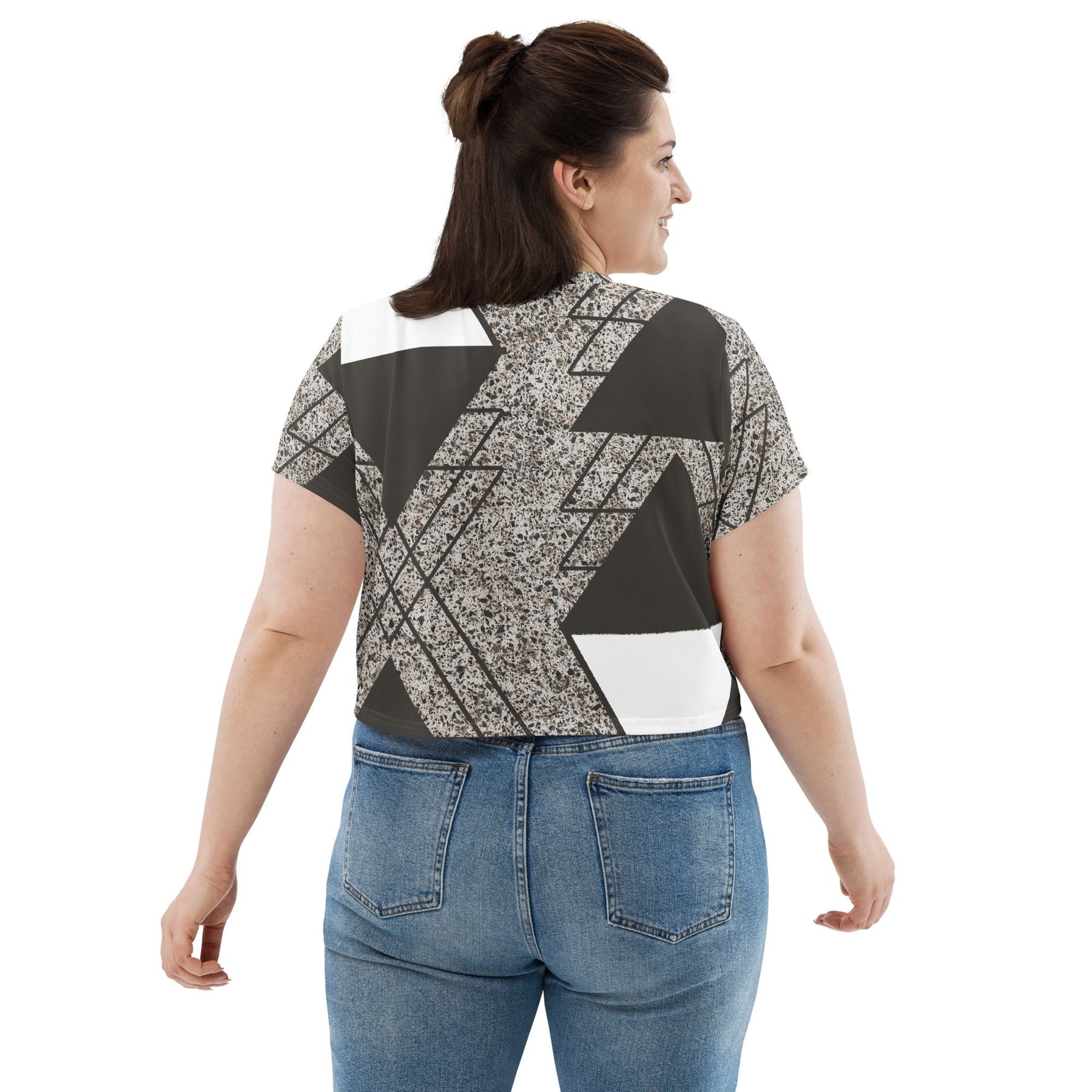 Womens Stretch Fit Crop Tee Jersey, Brown And White Triangular Colorblock. Our women's crop tee jersey offers a delightful blend of comfort and style, perfect for any casual occasion. Crafted from soft, breathable fabric, this chic top features a cropped silhouette that pairs effortlessly with high-waisted bottoms for a trendy look. The crew neckline and short sleeves enhance its laid-back appeal, making it an ideal choice for workouts, outings, or lounging at home. This versatile piece is a must-have addition to your wardrobe, ensuring you stay fashionable and comfortable all day long.