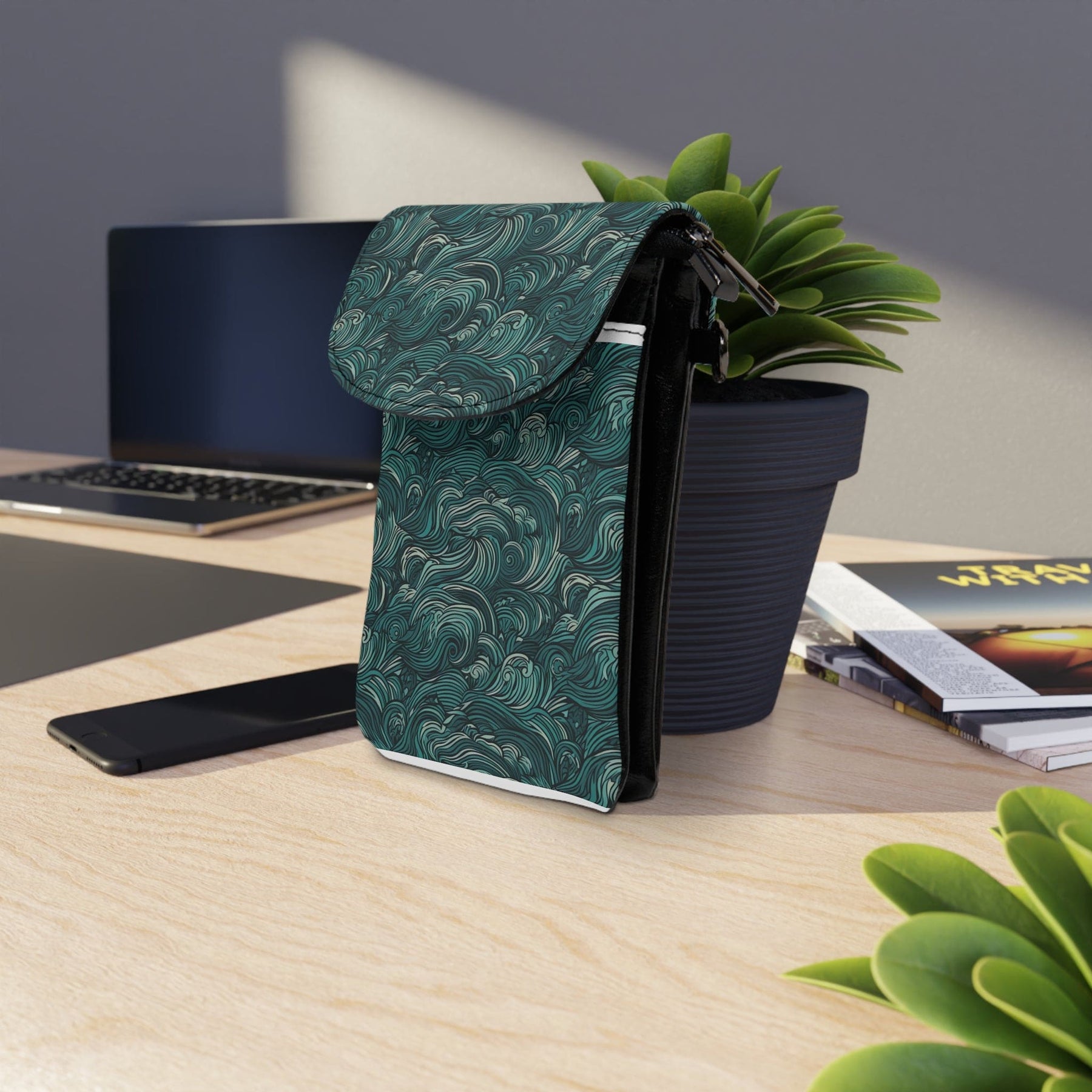 Water Wave Mint Green Illustration Crossbody Cell Phone Wallet Purse. This crossbody shoulder bag is compact and adds a splash of style. It comes in one size (7.5" x 4.9") and features an extendable faux leather strap (29.6" to 51.2"). Two main compartments have a flip-up cover—one for a phone and three hidden ones for regular size cards. Made from high-grade microfiber leather.