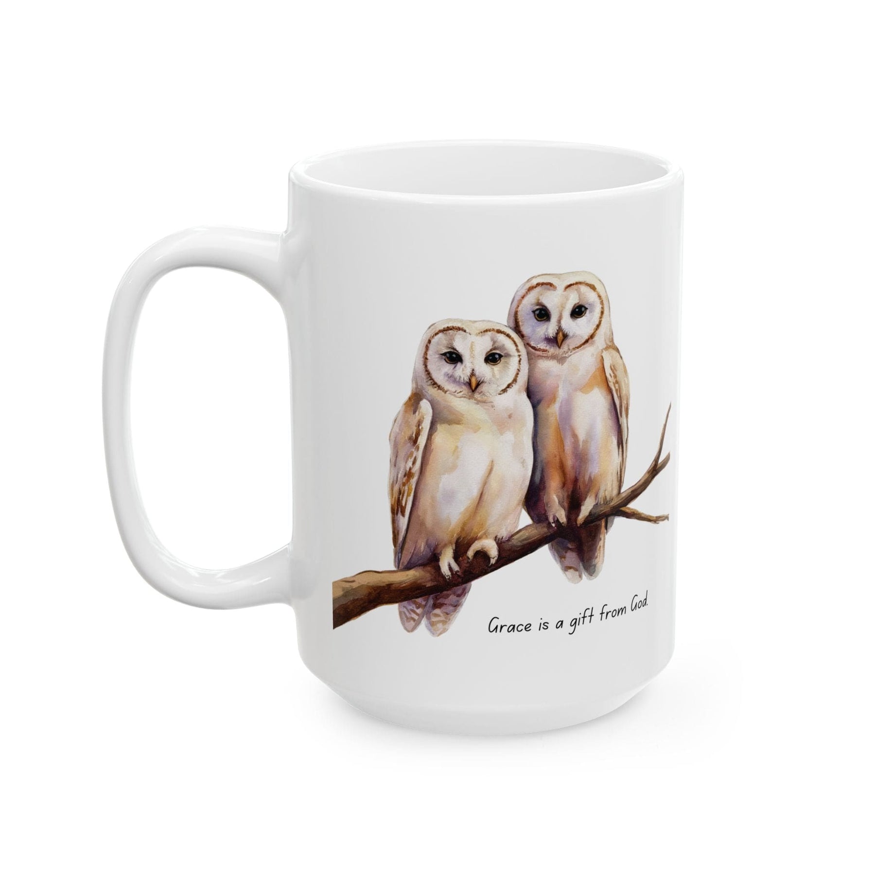 Ceramic Gift Mug - Two White Owls - Scripture Inspired - Grace is a Gift from God