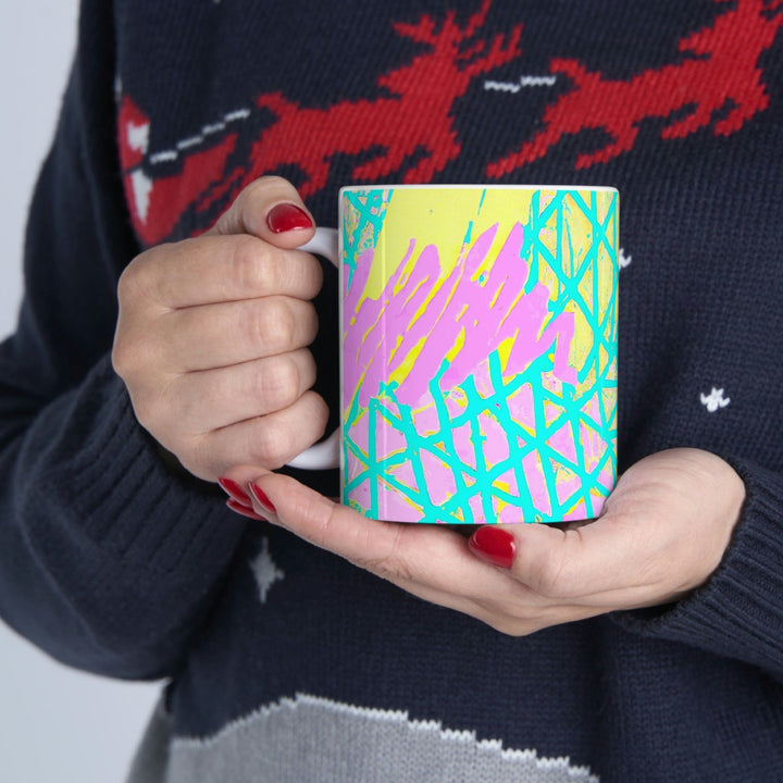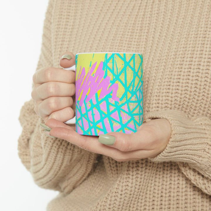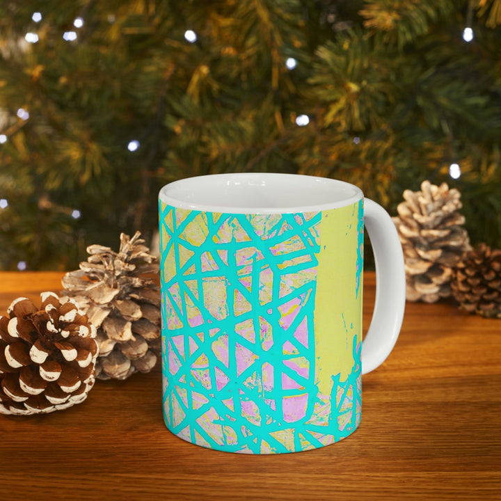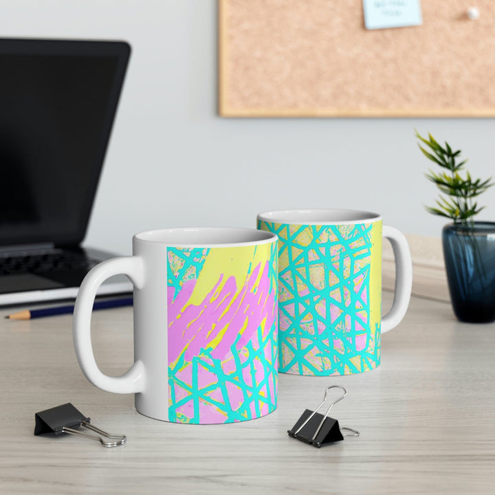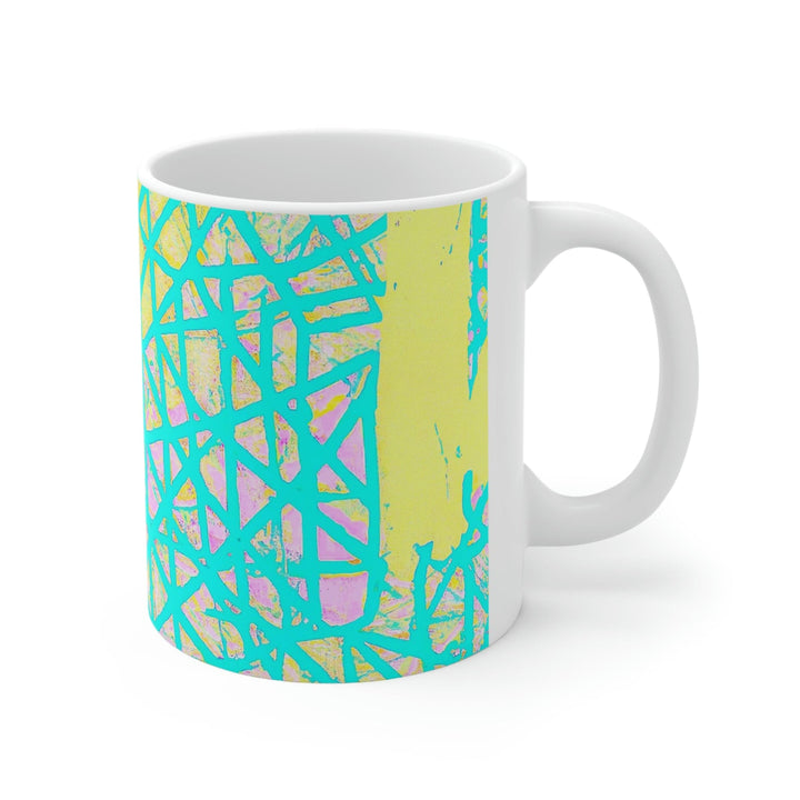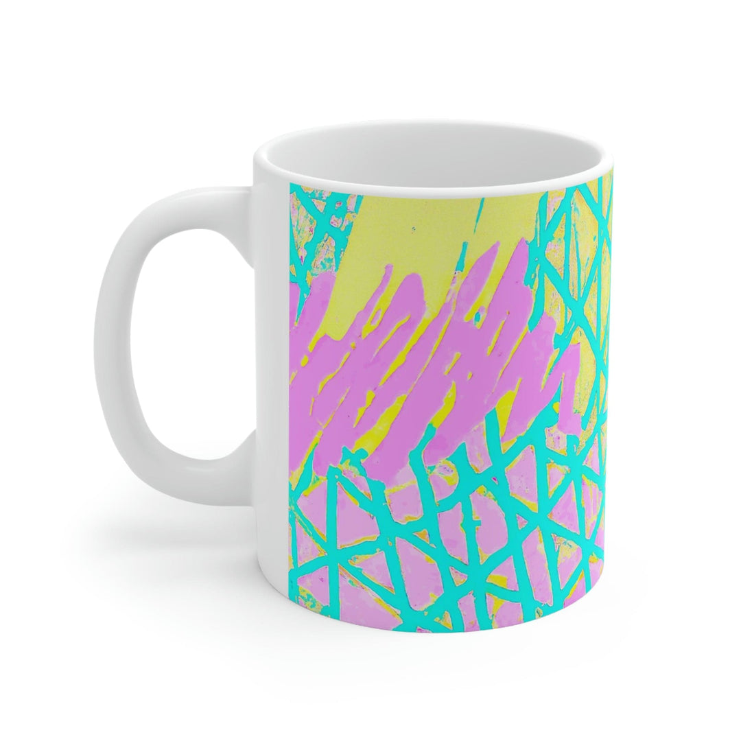Cyan Blue Lime Green And Pink Pattern. Warm-up with a nice cuppa out of this customized ceramic coffee mug. Personalize it with cool designs, photos or logos to make that "aaahhh!" moment even better. It’s BPA and Lead-free, microwave & dishwasher-safe, and made of white, durable ceramic in 11-ounce size. Thanks to the advanced printing tech, your designs come to life with incredibly vivid colors – the perfect gift for coffee, tea, and chocolate lovers.
