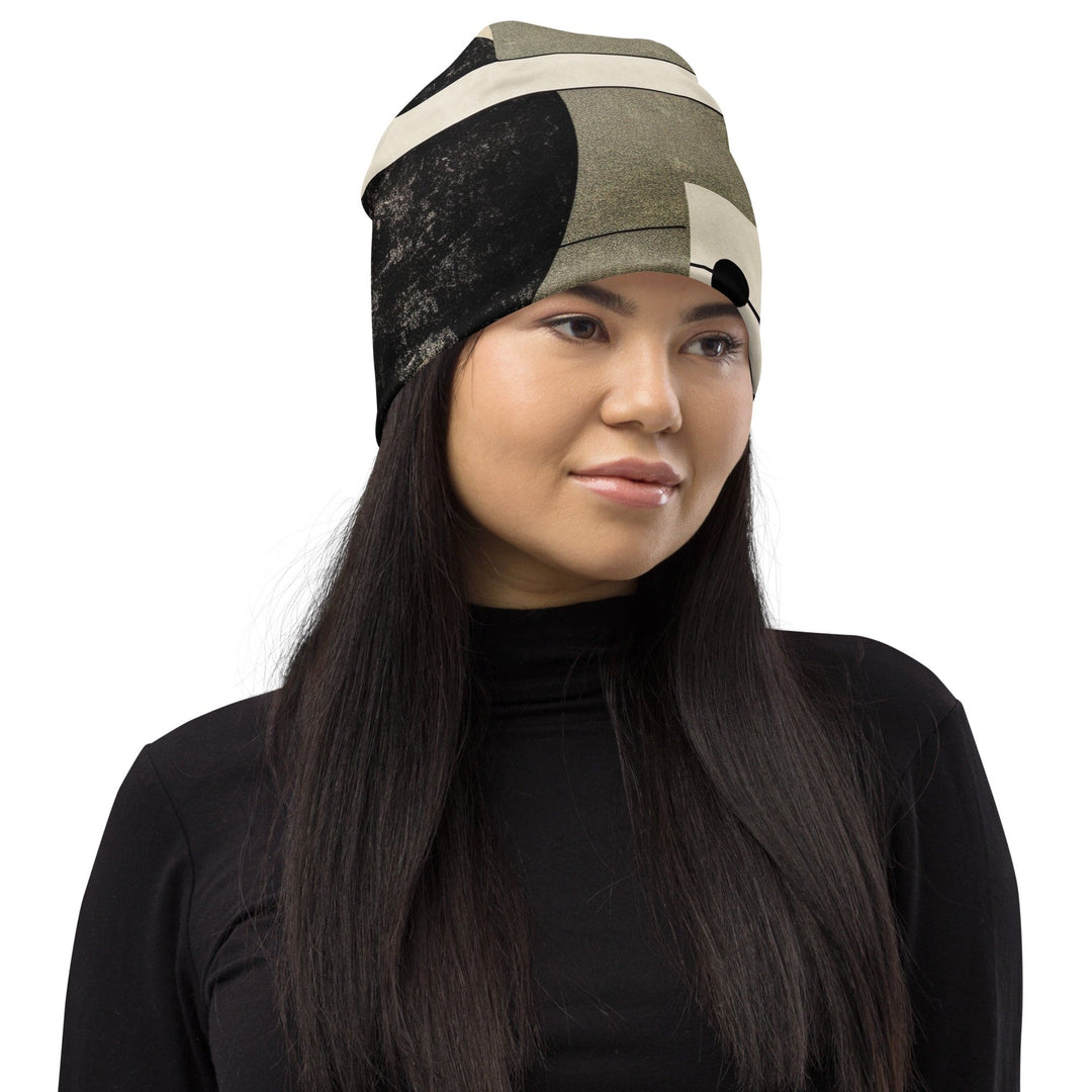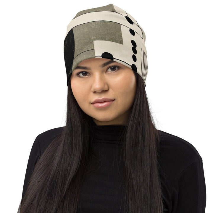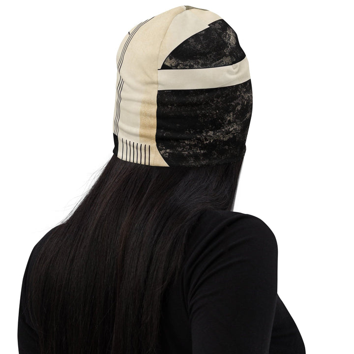 Double-layered Beanie Hat Abstract Black Beige Brown Geometric - Unisex/Beanie