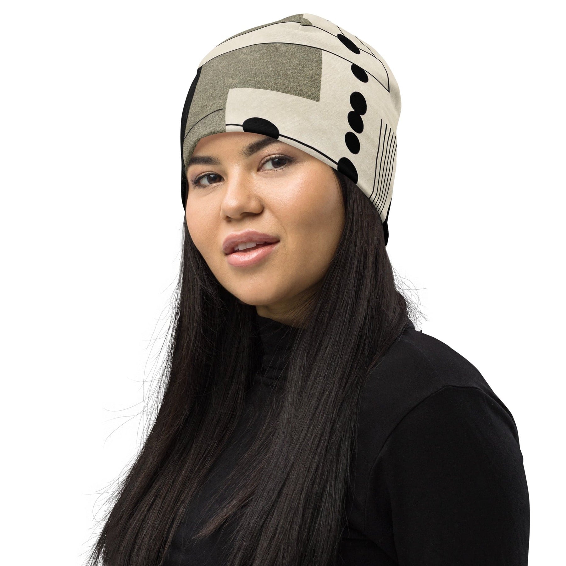 Double-layered Beanie Hat Abstract Black Beige Brown Geometric