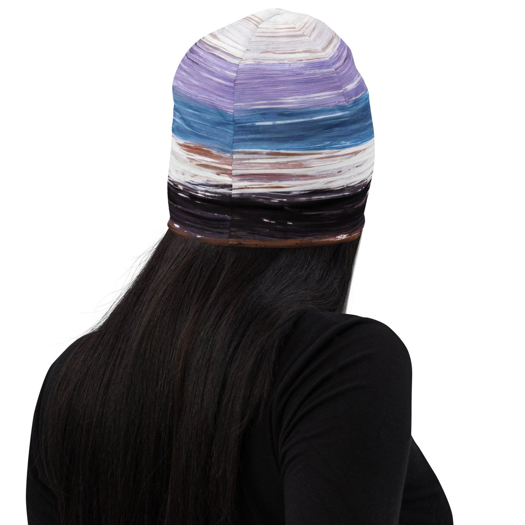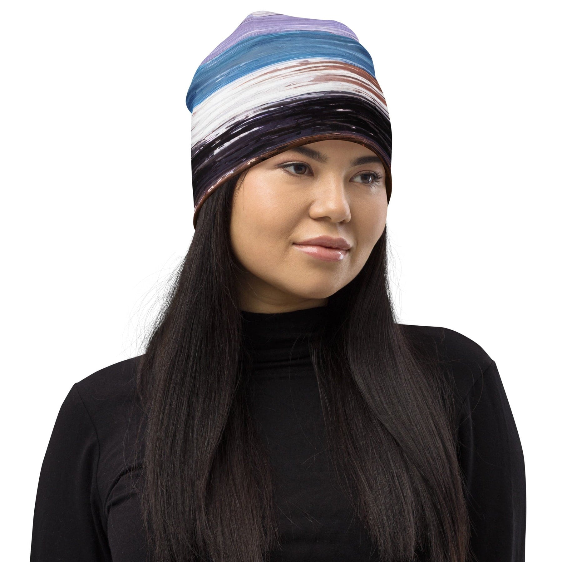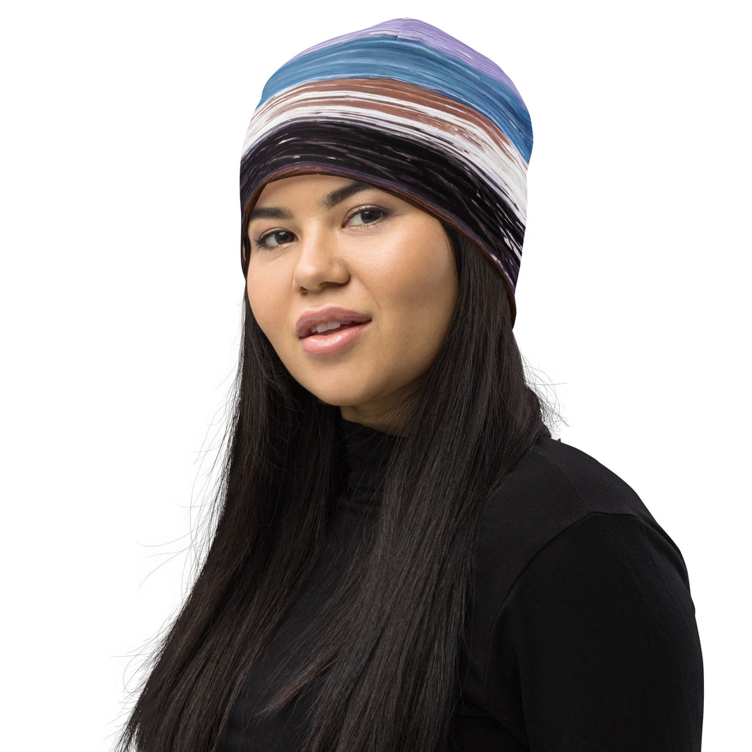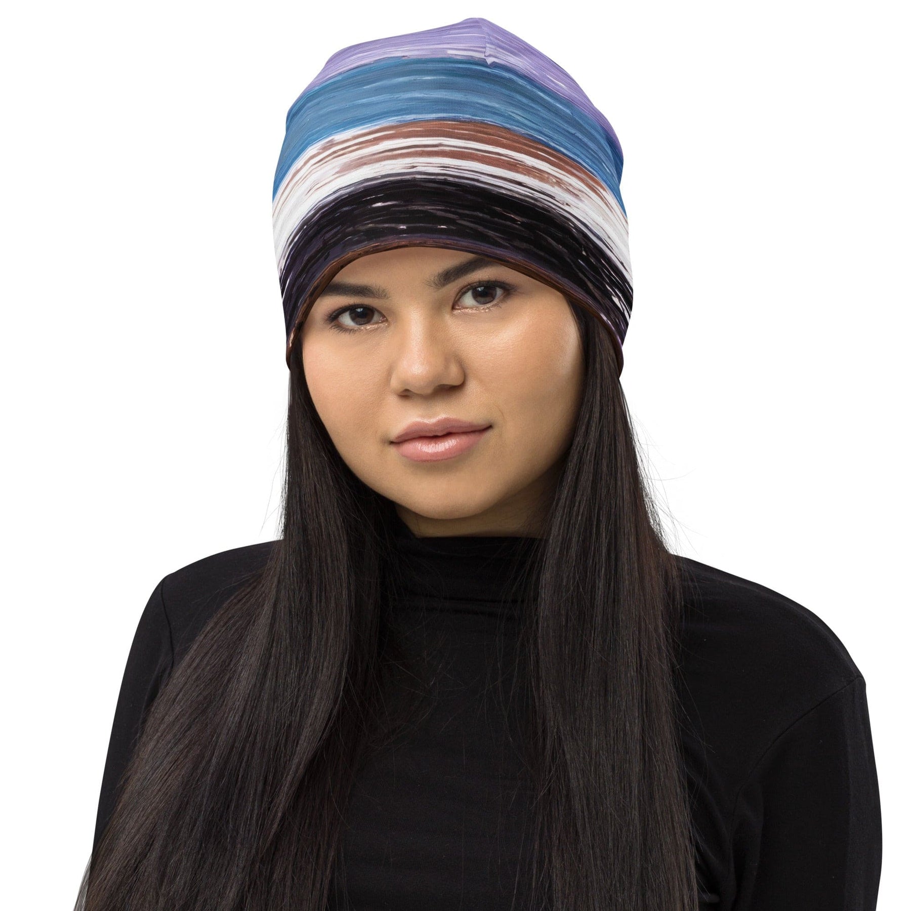 Double-layered Beanie Hat Lavender Black Brown Rustic Pattern - Unisex/Beanie