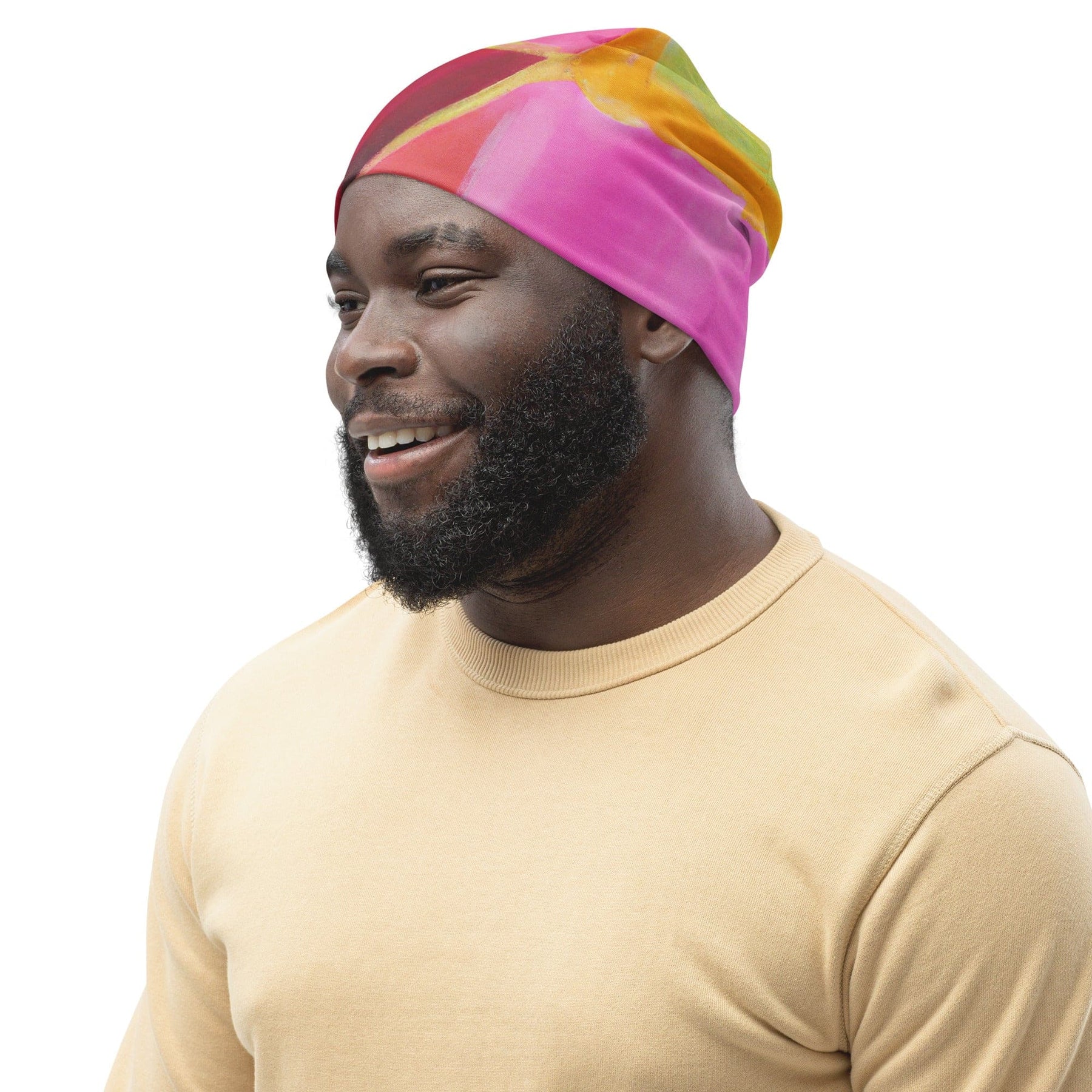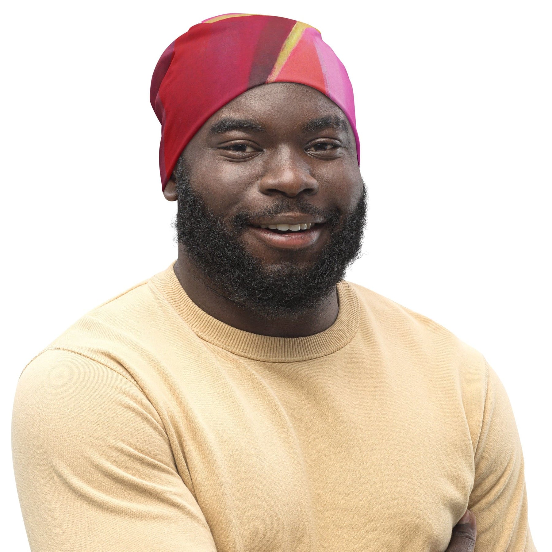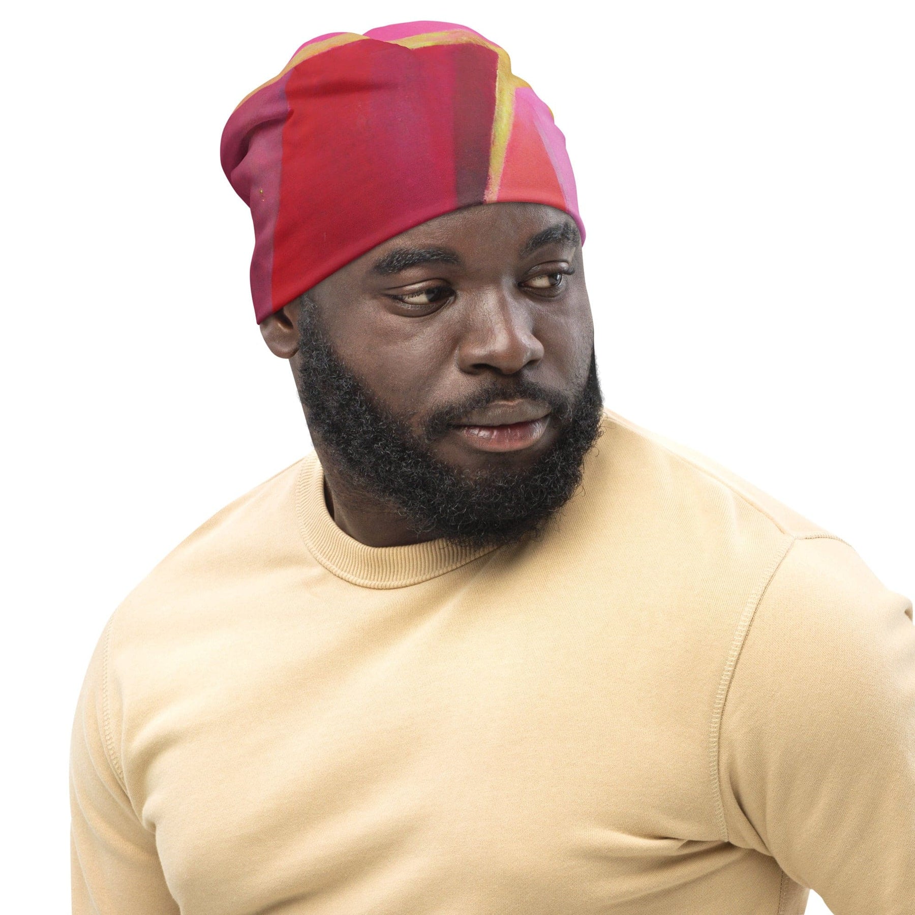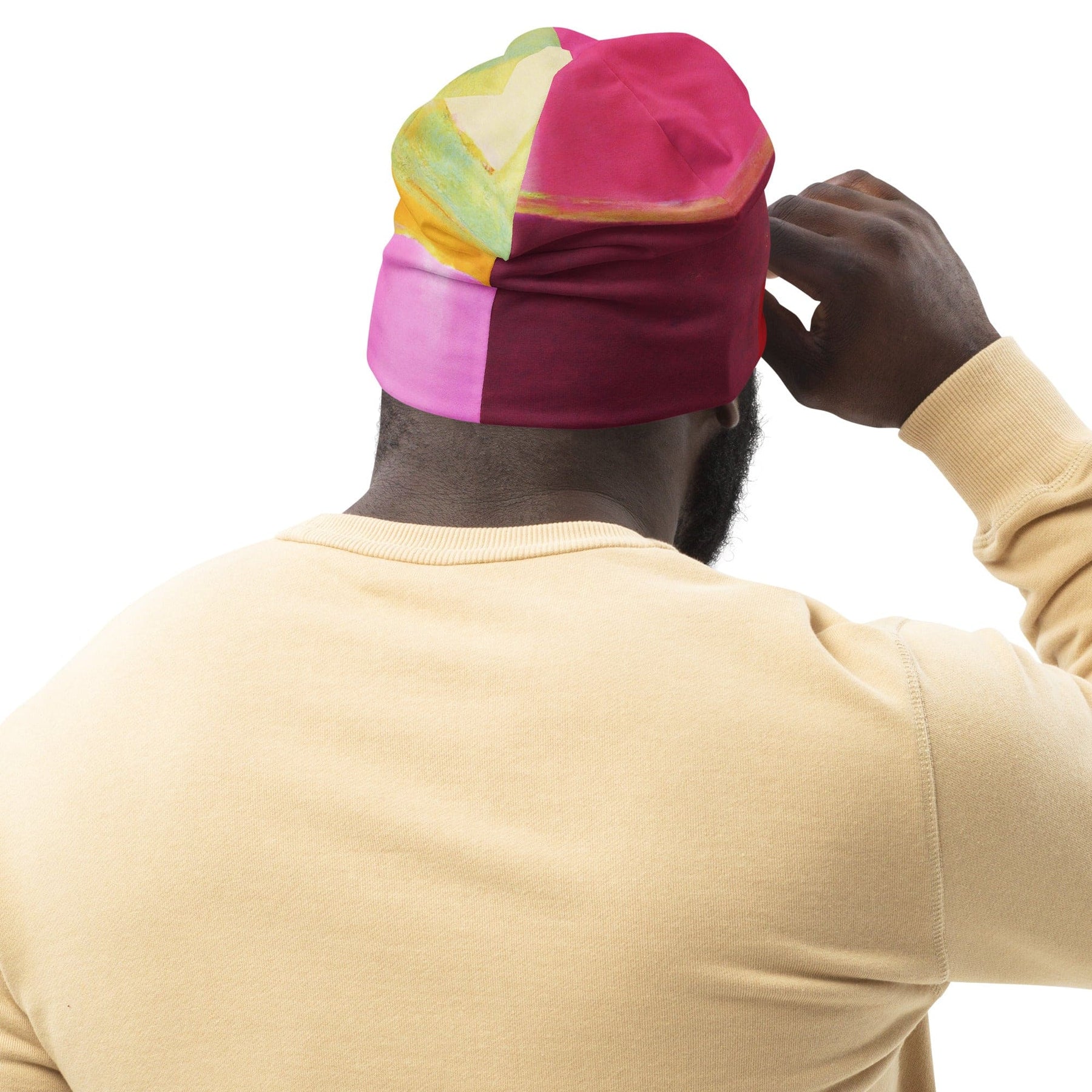Double-layered Beanie Hat Pink Mauve Red Geometric Pattern - Unisex/Beanie