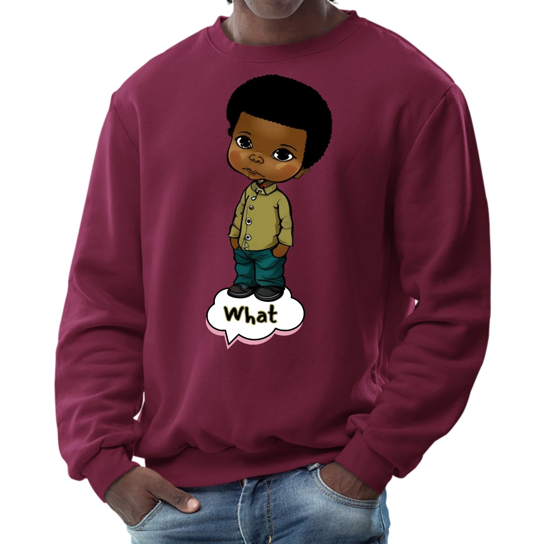 Mens Graphic Sweatshirt, What, African American Boy Illustration Art. This crewneck sweatshirt exudes classic appeal with its comfortable pullover style and cozy fleece construction. Crafted from affordable cotton, this versatile crewneck offers a stylish sweatshirt design. The quality fabric ensures everyday casual comfort, making it a trendy and timeless option for daily wear. The soft-blend fleece design adds an extra layer of coziness, while the affordable price makes it an accessible choice for everyone. Whether you prefer a classic pullover sweatshirt or a versatile crewneck option, this sweatshirt caters to a variety of preferences, providing a staple for your wardrobe in a variety of colors. Suitable for everyone, this sweatshirt is the epitome of affordable and stylish everyday comfort.