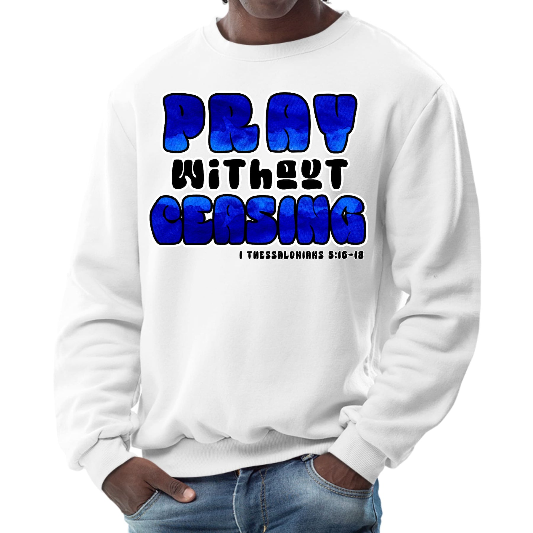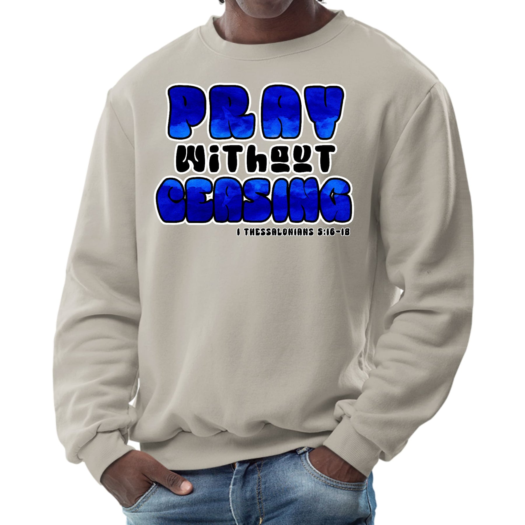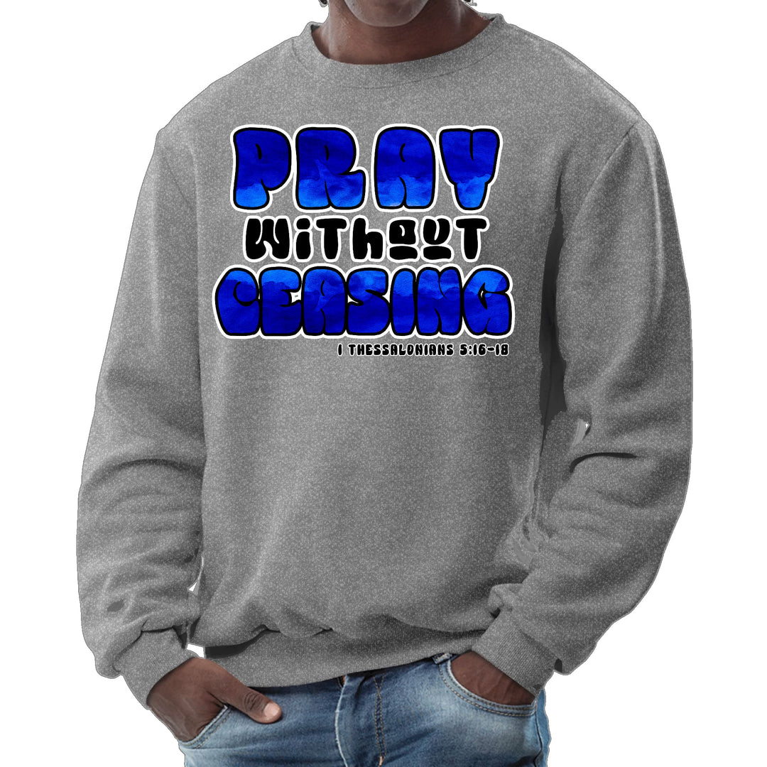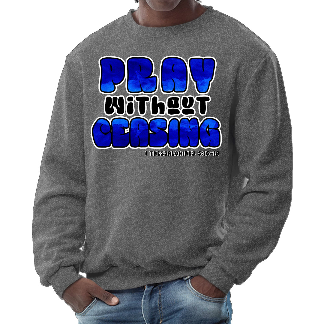 Mens Graphic Sweatshirt, Pray Without Ceasing, Inspirational Illustration. This crewneck sweatshirt exudes classic appeal with its comfortable pullover style and cozy fleece construction. Crafted from affordable cotton, this versatile crewneck offers a stylish sweatshirt design. The quality fabric ensures everyday casual comfort, making it a trendy and timeless option for daily wear. The soft-blend fleece design adds an extra layer of coziness, while the affordable price makes it an accessible choice for everyone. Whether you prefer a classic pullover sweatshirt or a versatile crewneck option, this sweatshirt caters to a variety of preferences, providing a staple for your wardrobe in a variety of colors. Suitable for everyone, this sweatshirt is the epitome of affordable and stylish everyday comfort.