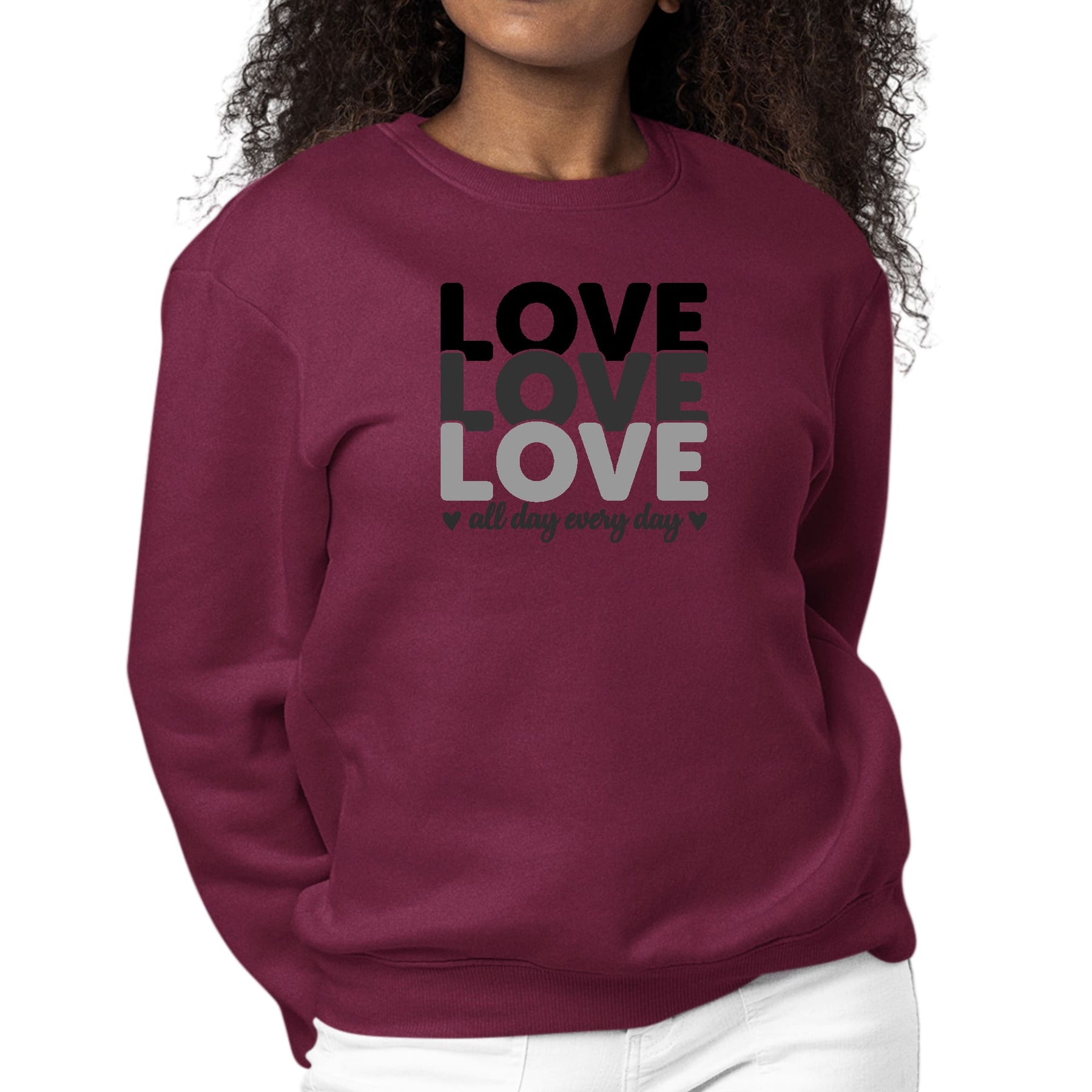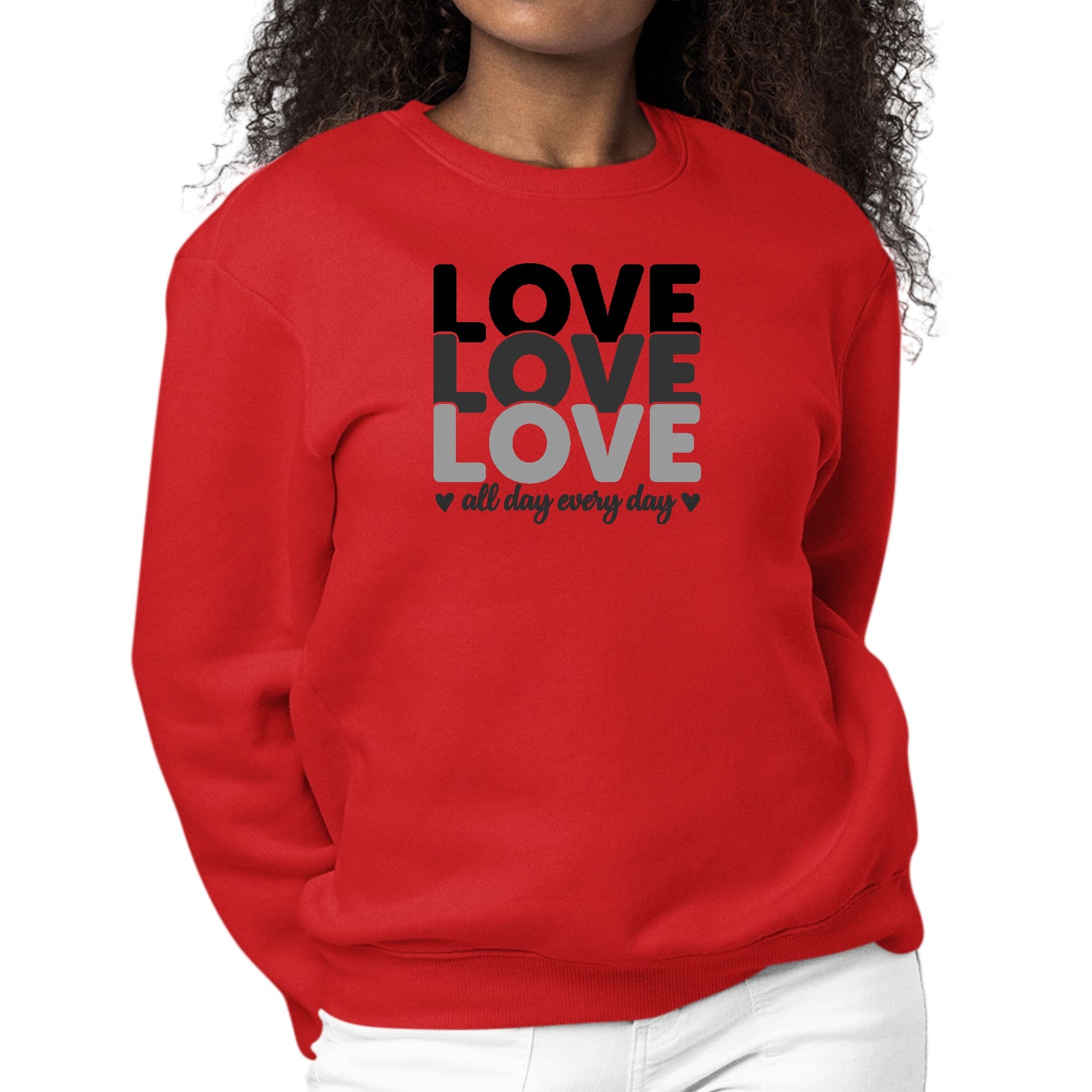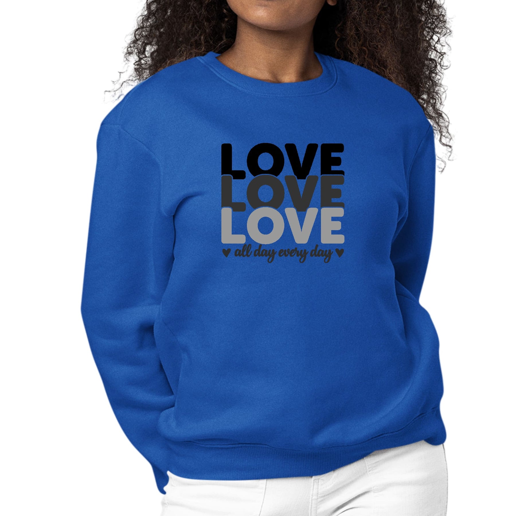 Womens Graphic Sweatshirt Love All Day Every Day Black Print. This crewneck sweatshirt exudes classic appeal with its comfortable pullover style and cozy fleece construction. Crafted from affordable cotton, this versatile crewneck offers a stylish sweatshirt design. The quality fabric ensures everyday casual comfort, making it a trendy and timeless option for daily wear. The soft-blend fleece design adds an extra layer of coziness, while the affordable price makes it an accessible choice for everyone. Whether you prefer a classic pullover sweatshirt or a versatile crewneck option, this sweatshirt caters to a variety of preferences, providing a staple for your wardrobe in a variety of colors. Suitable for everyone, this sweatshirt is the epitome of affordable and stylish everyday comfort.