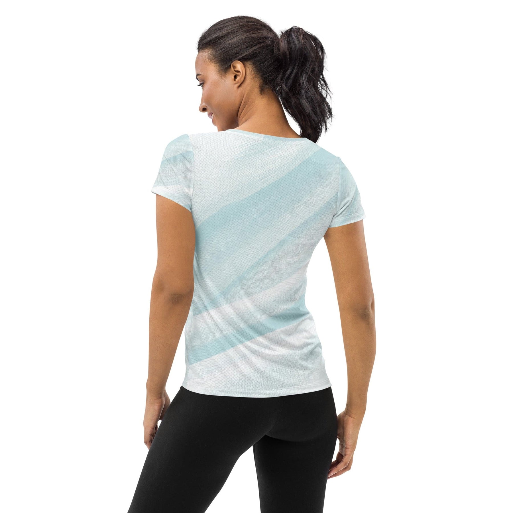 Womens Stretch Fit Athletic Sports T-Shirt, Pastel Blue Swirl. Our Women's Stretch Fit Athletic Sports T-shirt is engineered to enhance your performance and comfort during workouts. Crafted from premium stretch fabric, this t-shirt offers a form-fitting yet flexible fit that moves with your body, allowing for unrestricted movement. The moisture-wicking properties of the fabric keep you dry and comfortable, even during the most intense exercise sessions. Designed with an athletic silhouette, featuring a crew neckline and short sleeves, this t-shirt provides a classic and versatile look suitable for any activity. Whether you're hitting the gym, going for a run, or participating in sports, this t-shirt is your ultimate choice for optimal performance and style.