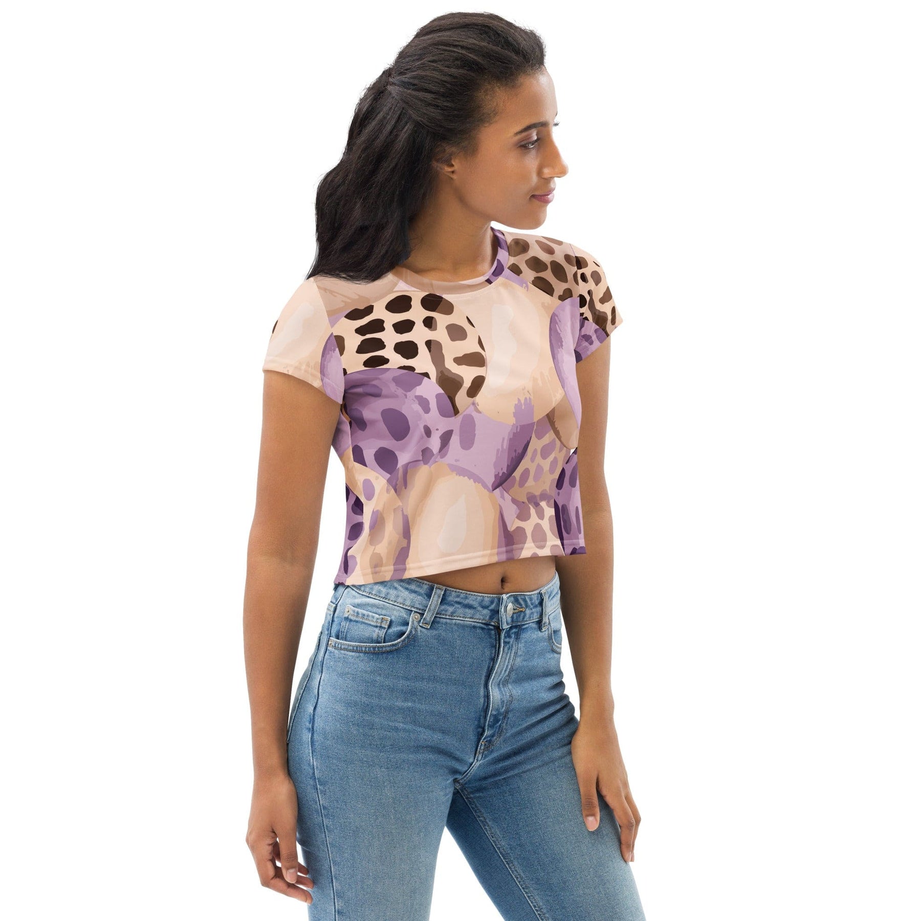 Womens Stretch Fit Crop Tee, Purple Lavender Spotted Print. Our women's crop tee jersey offers a delightful blend of comfort and style, perfect for any casual occasion. Crafted from soft, breathable fabric, this chic top features a cropped silhouette that pairs effortlessly with high-waisted bottoms for a trendy look. The crew neckline and short sleeves enhance its laid-back appeal, making it an ideal choice for workouts, outings, or lounging at home. This versatile piece is a must-have addition to your wardrobe, ensuring you stay fashionable and comfortable all day long.