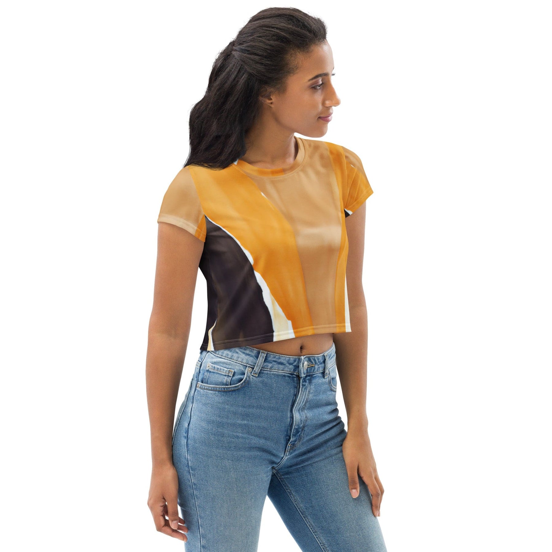 Womens Stretch Fit Crop Tee, Yellow Brown Abstract Pattern . Our women's crop tee jersey offers a delightful blend of comfort and style, perfect for any casual occasion. Crafted from soft, breathable fabric, this chic top features a cropped silhouette that pairs effortlessly with high-waisted bottoms for a trendy look. The crew neckline and short sleeves enhance its laid-back appeal, making it an ideal choice for workouts, outings, or lounging at home. This versatile piece is a must-have addition to your wardrobe, ensuring you stay fashionable and comfortable all day long.