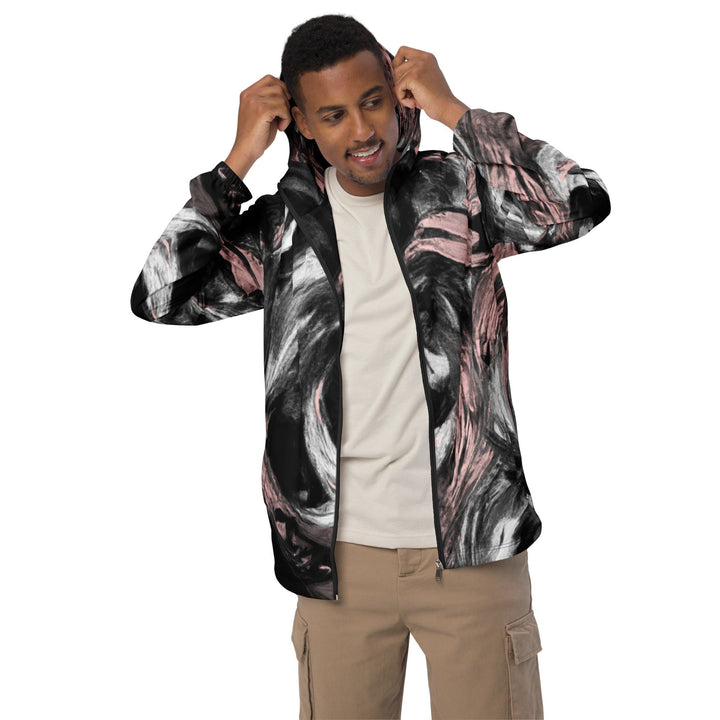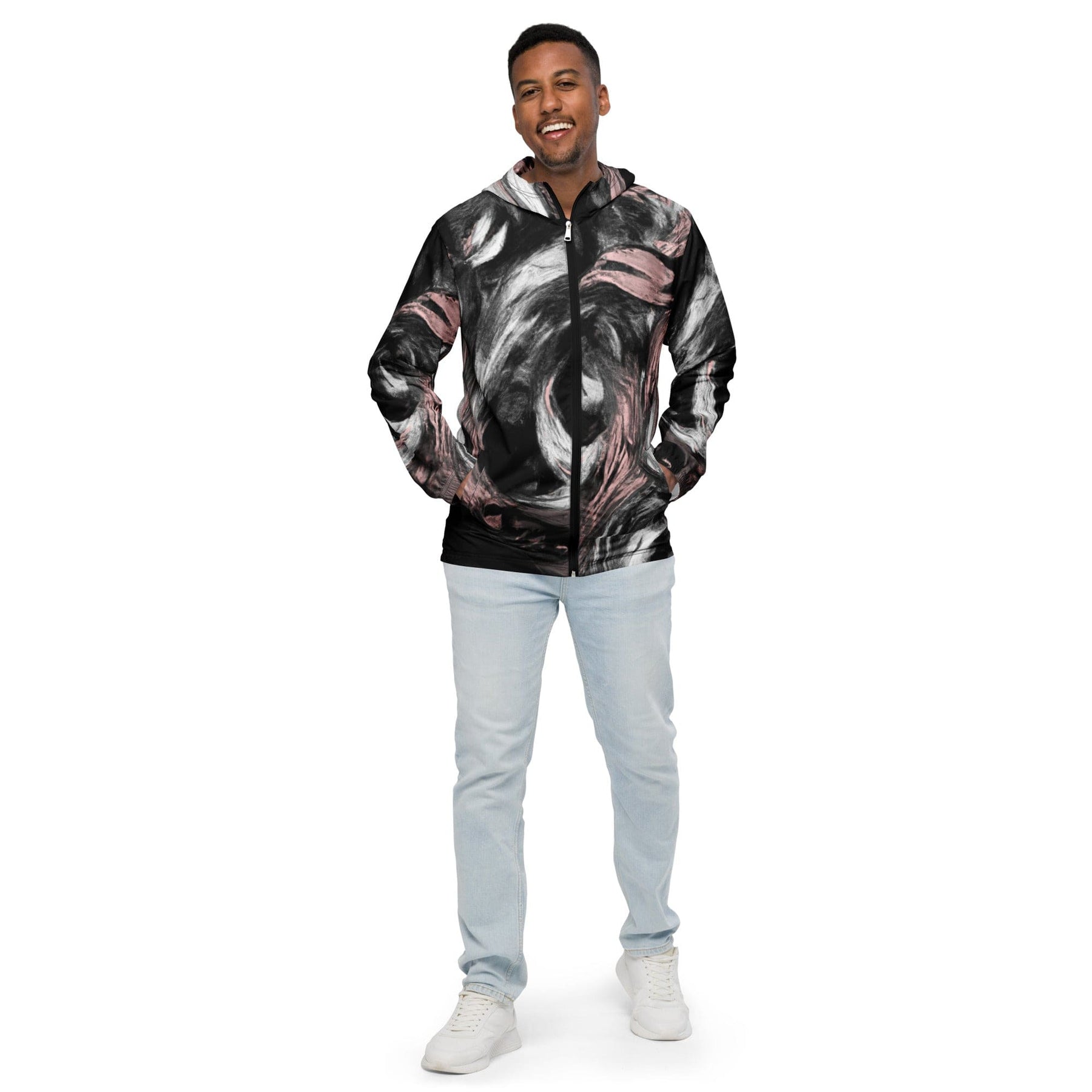 Mens Hooded Windbreaker Jacket, Black Pink White Abstract Pattern. This lightweight windbreaker ensures maximum comfort on windy, rainy, and sunny days, thanks to the water-resistant fabric and breathable mesh lining. The windbreaker has an effortless look that will fit different styles and can be easily layered with long and short sleeve shirts.
