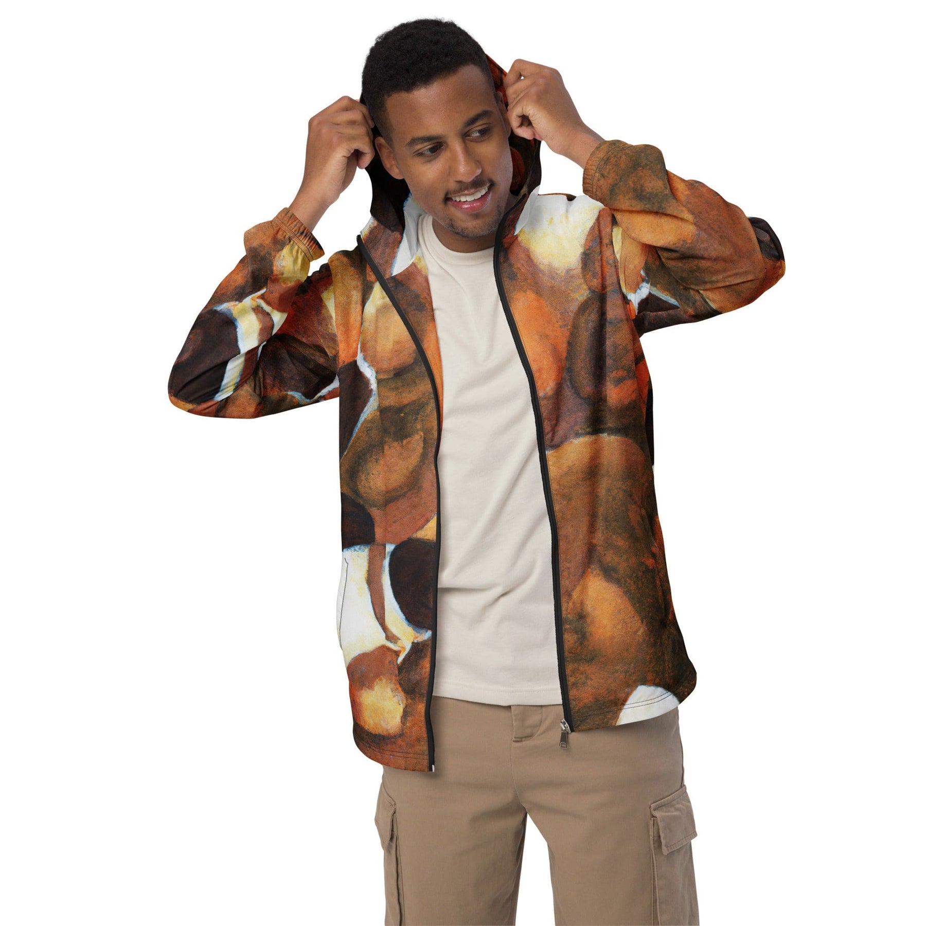 Mens Hooded Windbreaker Jacket, Brown White Stone Pattern . This lightweight windbreaker ensures maximum comfort on windy, rainy, and sunny days, thanks to the water-resistant fabric and breathable mesh lining. The windbreaker has an effortless look that will fit different styles and can be easily layered with long and short sleeve shirts.