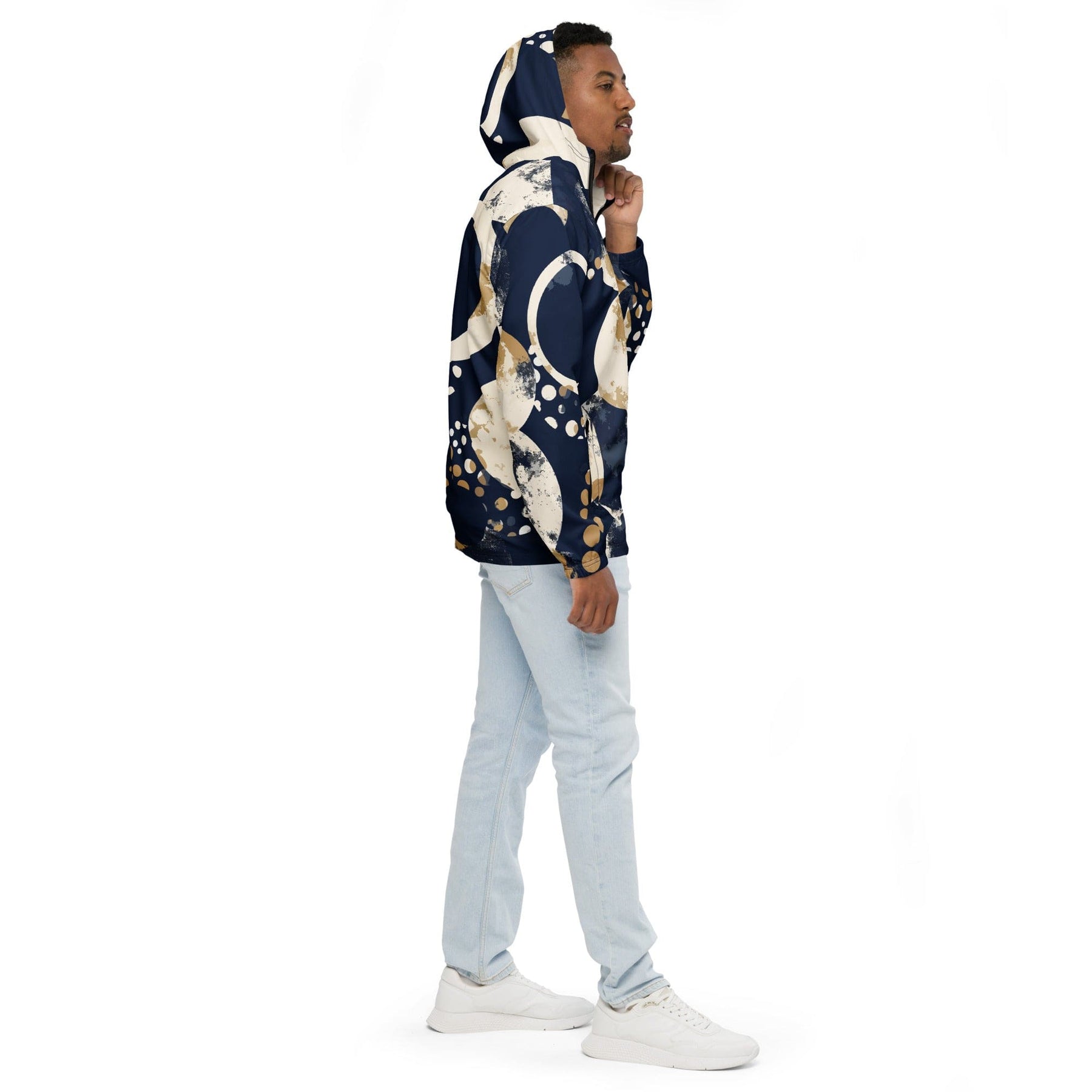 Mens Hooded Windbreaker Jacket, Blue Beige Spotted Print. This lightweight windbreaker ensures maximum comfort on windy, rainy, and sunny days, thanks to the water-resistant fabric and breathable mesh lining. The windbreaker has an effortless look that will fit different styles and can be easily layered with long and short sleeve shirts.
