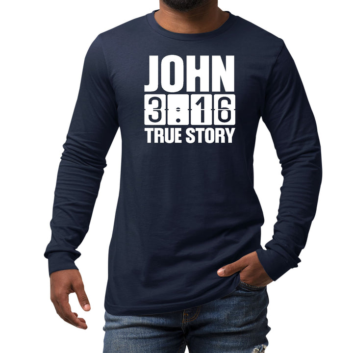 Mens Long Sleeve Graphic T-Shirt, John 3:16 True Story Print. Discover the versatility and style of this moisture wicking performance T-shirt. This unisex long sleeve t-shirt is designed to be a go-to choice in all seasons, whether it's the perfect fall shirt, a stylish option for spring, or a cozy companion in winter. Crafted from breathable fabric, it combines comfort and fashion effortlessly.