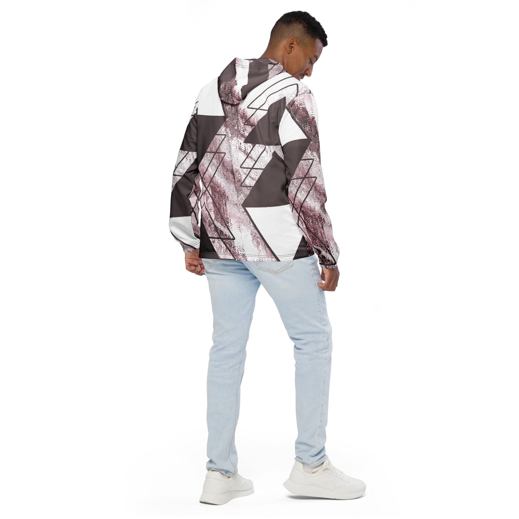 Mens Hooded Windbreaker Jacket, Mauve Rose And White Triangular Colorblock. This lightweight windbreaker ensures maximum comfort on windy, rainy, and sunny days, thanks to the water-resistant fabric and breathable mesh lining. The windbreaker has an effortless look that will fit different styles and can be easily layered with long and short sleeve shirts.