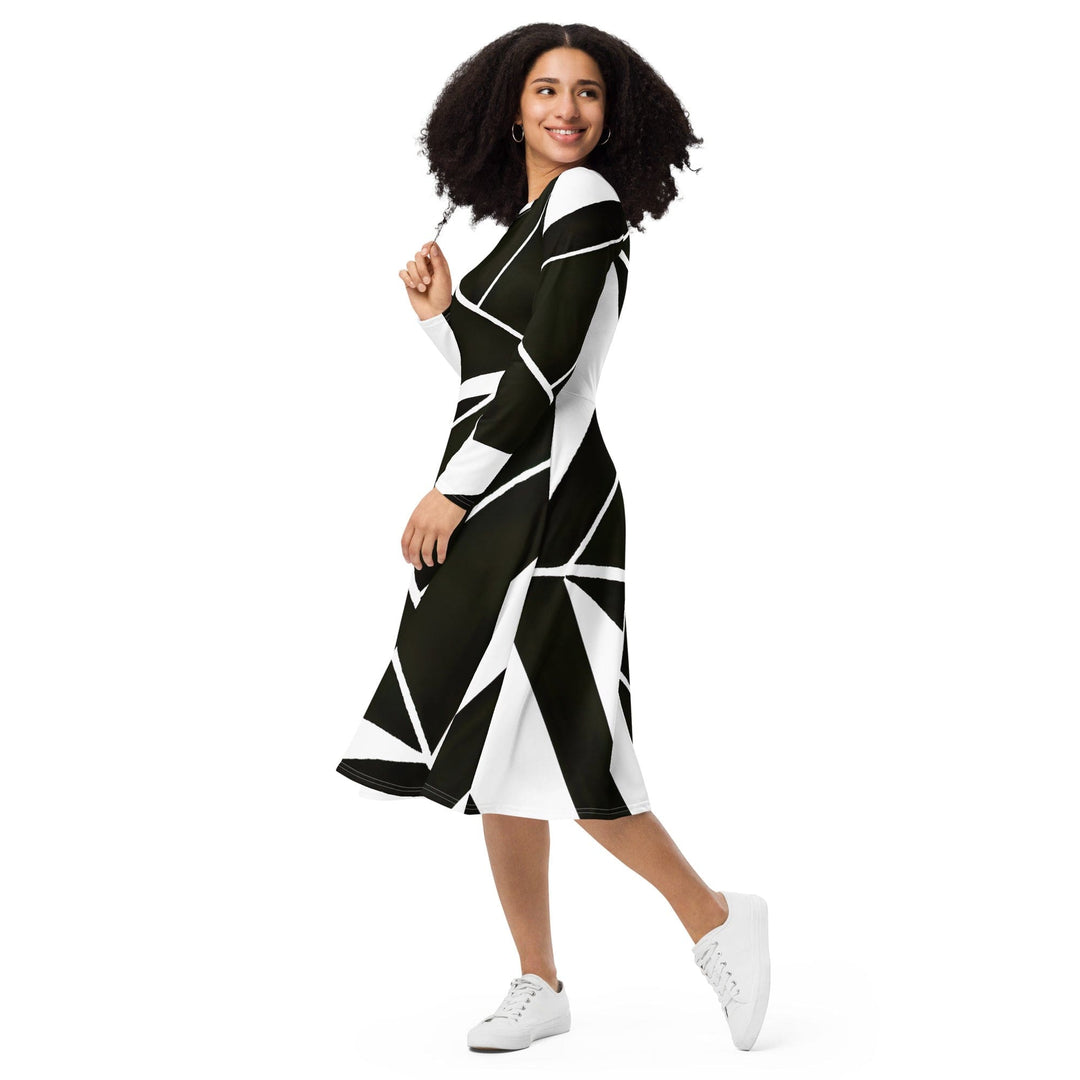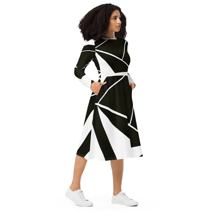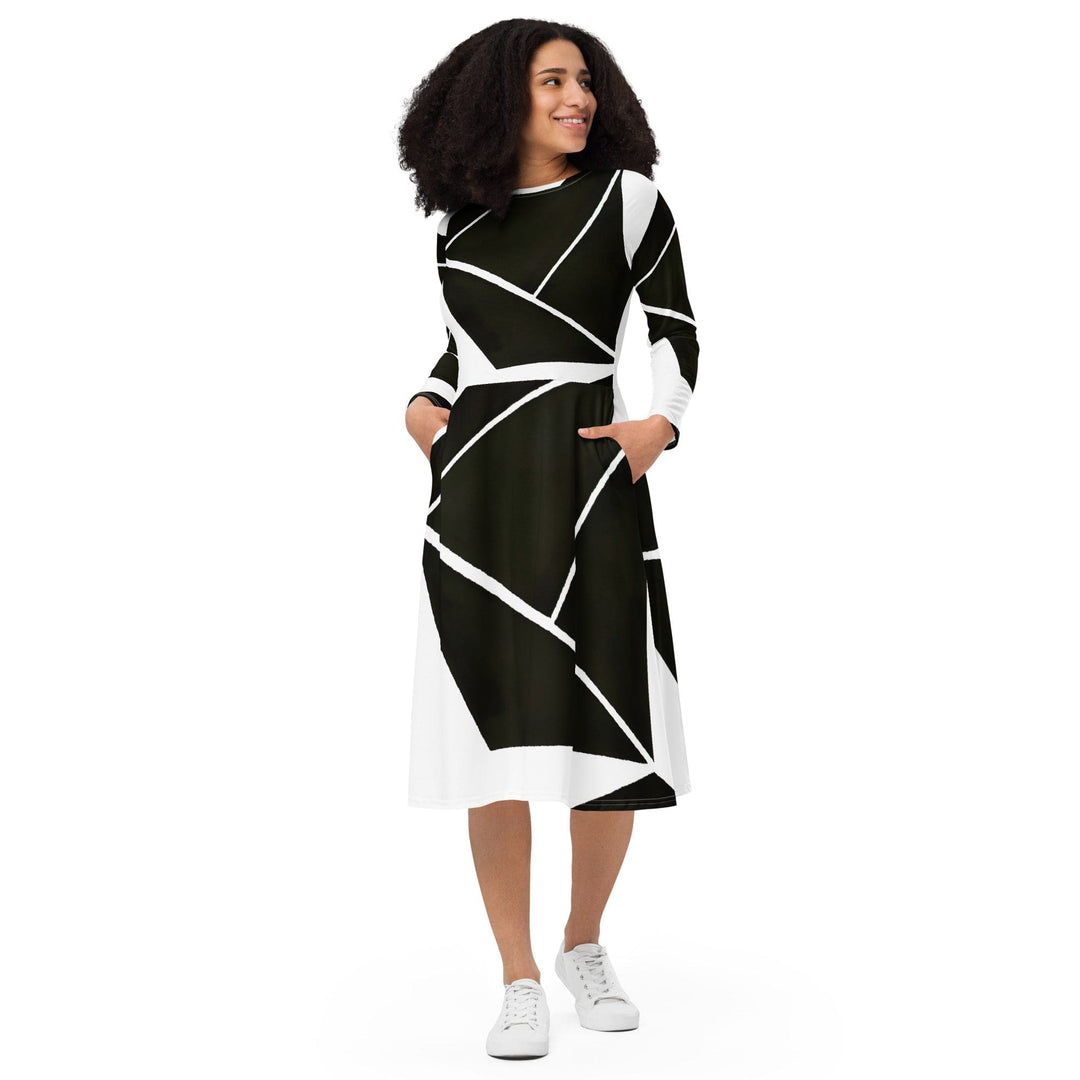 Womens Long Sleeve Midi Dress, Black And White Geometric Pattern. Meet your new favorite dress! Its soft fabric and flattering cut will ensure you feel comfortable and feminine all day long. Plus, the fitted waist and flared bottom part of the dress will accentuate the wearer’s naturally beautiful silhouette. The best part about the dress? It. Has. Pockets.