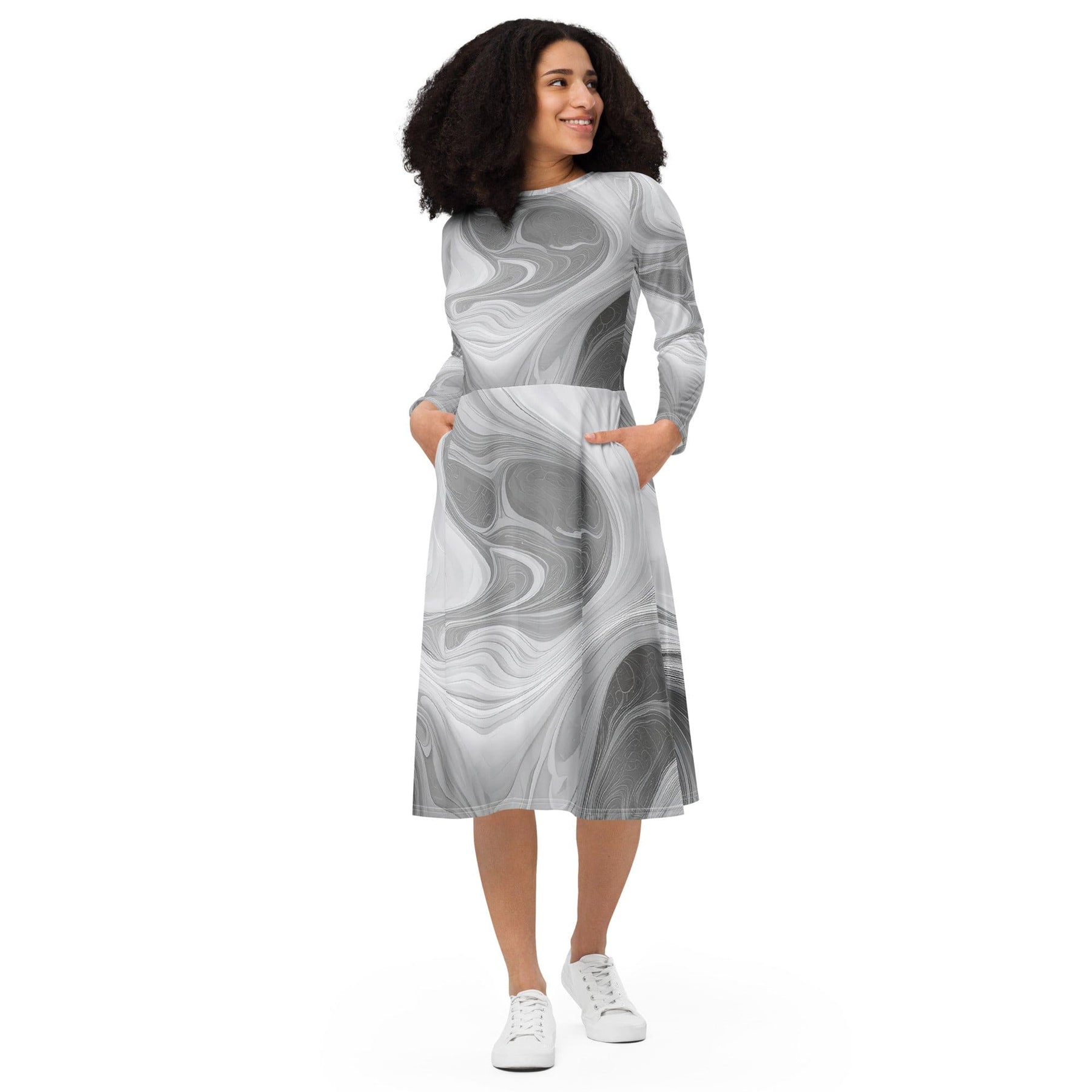 Womens Long Sleeve Midi Dress, Grey White BOHO Marble Print. Meet your new favorite dress! Its soft fabric and flattering cut will ensure you feel comfortable and feminine all day long. Plus, the fitted waist and flared bottom part of the dress will accentuate the wearer’s naturally beautiful silhouette. The best part about the dress? It. Has. Pockets.