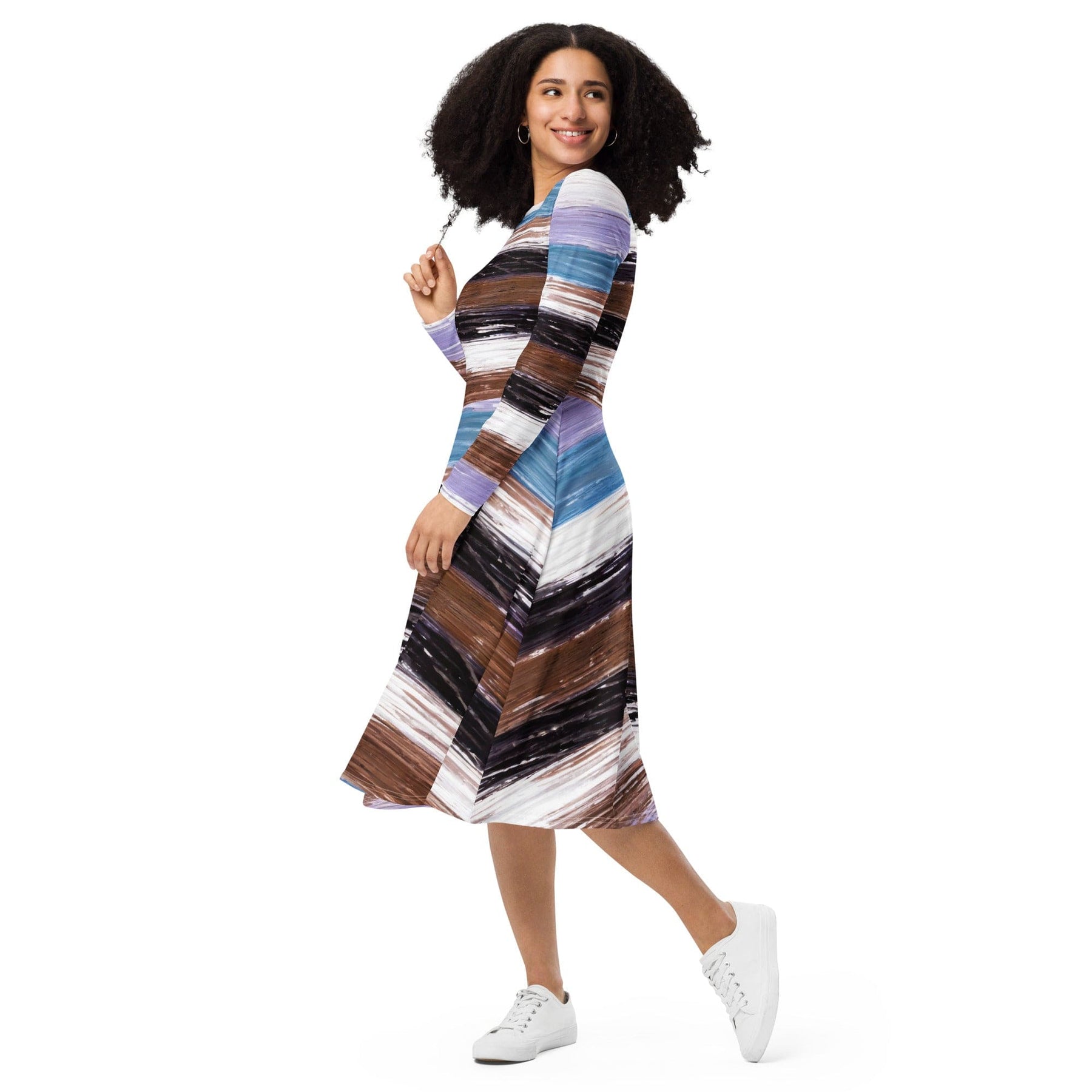 Womens Long Sleeve Midi Dress, Lavender Black Brown Rustic Pattern. Meet your new favorite dress! Its soft fabric and flattering cut will ensure you feel comfortable and feminine all day long. Plus, the fitted waist and flared bottom part of the dress will accentuate the wearer’s naturally beautiful silhouette. The best part about the dress? It. Has. Pockets.