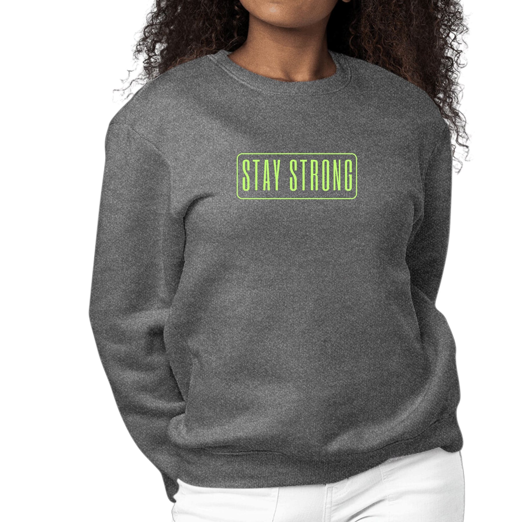 Womens Graphic Sweatshirt Stay Strong Neon Print. This crewneck sweatshirt exudes classic appeal with its comfortable pullover style and cozy fleece construction. Crafted from affordable cotton, this versatile crewneck offers a stylish sweatshirt design. The quality fabric ensures everyday casual comfort, making it a trendy and timeless option for daily wear. The soft-blend fleece design adds an extra layer of coziness, while the affordable price makes it an accessible choice for everyone. Whether you prefer a classic pullover sweatshirt or a versatile crewneck option, this sweatshirt caters to a variety of preferences, providing a staple for your wardrobe in a variety of colors. Suitable for everyone, this sweatshirt is the epitome of affordable and stylish everyday comfort.