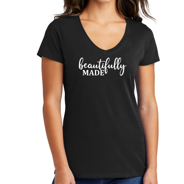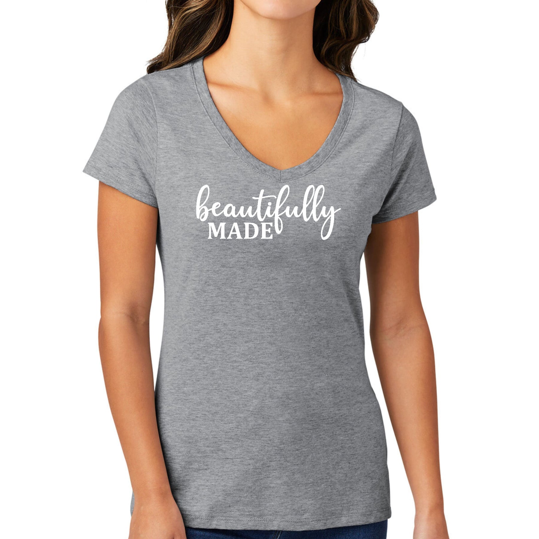 Womens V-Neck Graphic T-Shirt, Beautifully Made Inspiration Affirmation. This t-shirt is crafted with the imaginative and creative individual in mind, offering a dynamic style for those who appreciate unique designs. Tailored for creative personalities, this tee features a stylish print that stands out, making a bold and expressive statement. With its edgy graphics and modern design, it captures the essence of contemporary fashion while providing comfort for everyday wear. The tee effortlessly merges casual and artistic elements, making it an ideal choice for those who seek to infuse their wardrobe with a touch of originality. Perfect for individuals who embrace their creativity, this graphic T-shirt serves as a canvas for self-expression, allowing wearers to showcase their unique personalities through fashion.