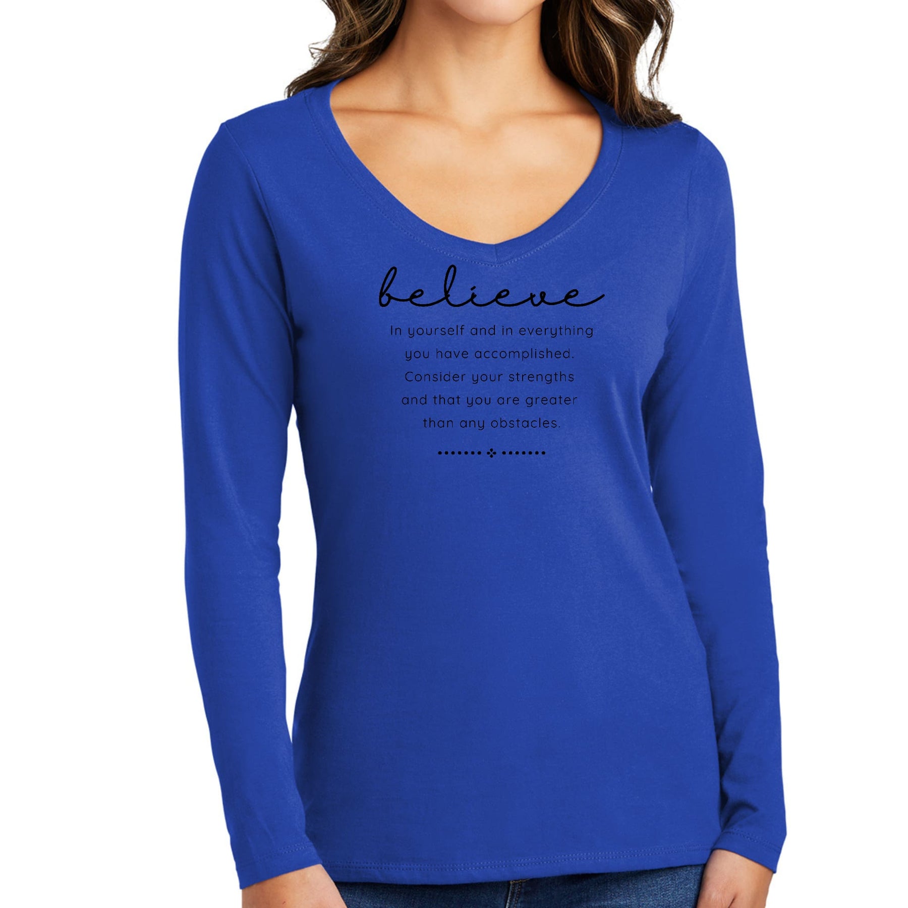 Womens Long Sleeve V-Neck Graphic T-Shirt, Believe In Yourself . Discover the versatility and style of our Long Sleeve Cotton T-Shirt. This unisex long sleeve t-shirt is designed to be a go-to choice in all seasons, whether it's the perfect fall shirt, a stylish option for spring, or a cozy companion in winter. Crafted from breathable cotton, it combines comfort and fashion effortlessly. Embrace the ultimate fusion of comfort and style with our unisex long sleeve t-shirts, and make a statement.