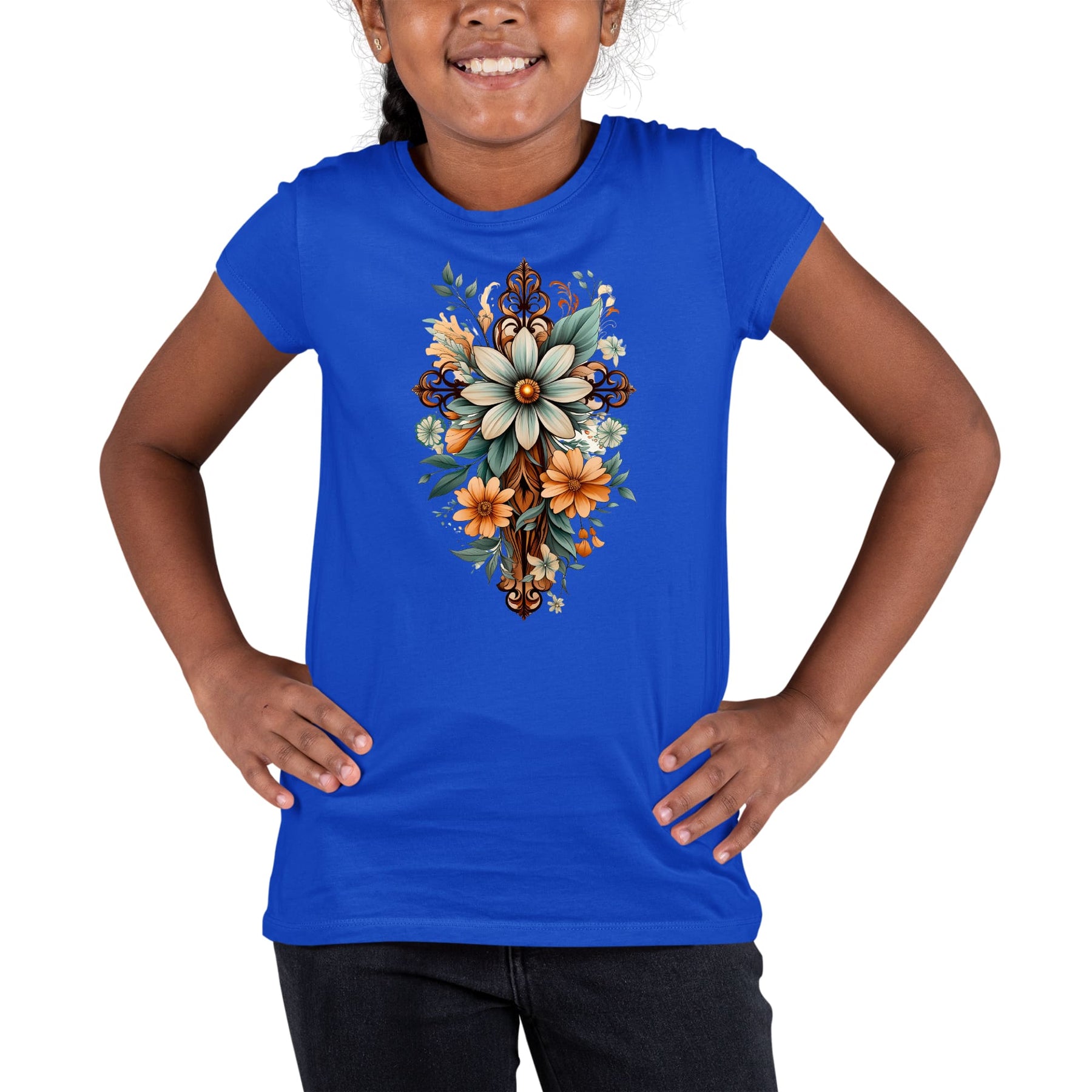 Youth Short Sleeve Graphic T-Shirt Christian Cross Floral Bouquet Green And Brown . This youth tee is super comfy. Made with preshrunk cotton, which means the shirt retains its softness and size after being washed.