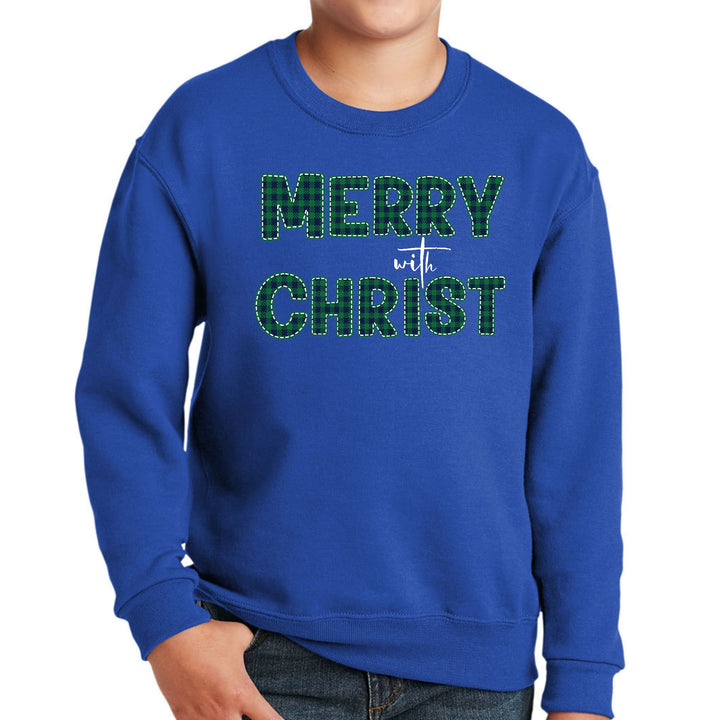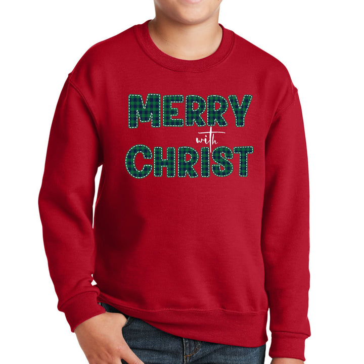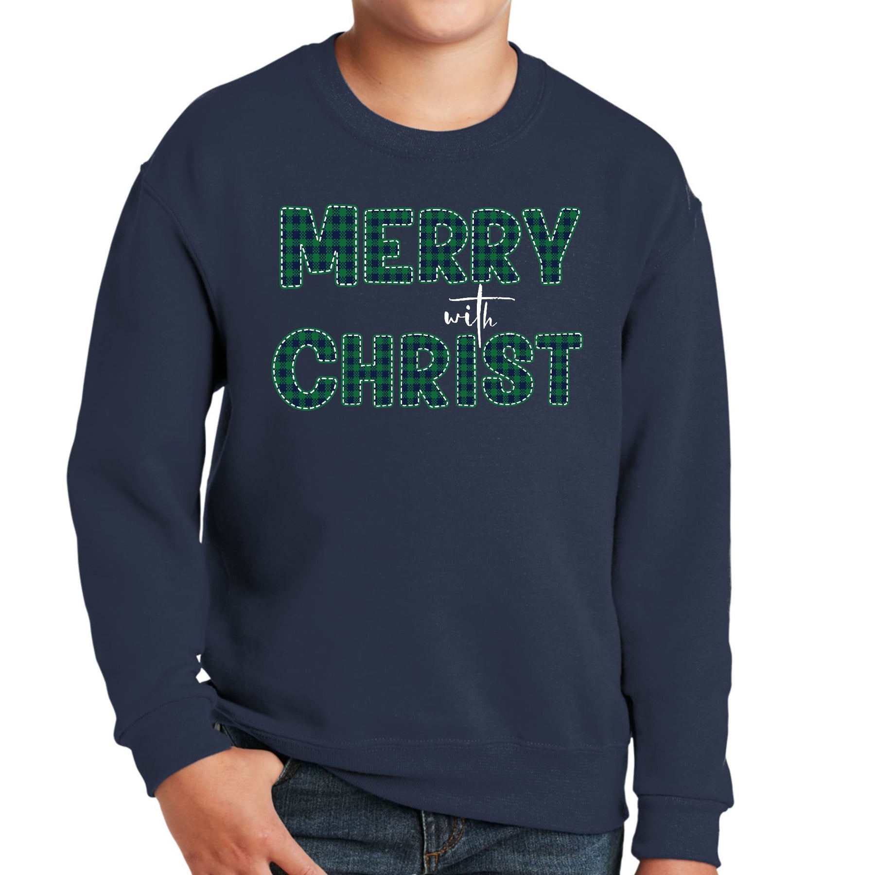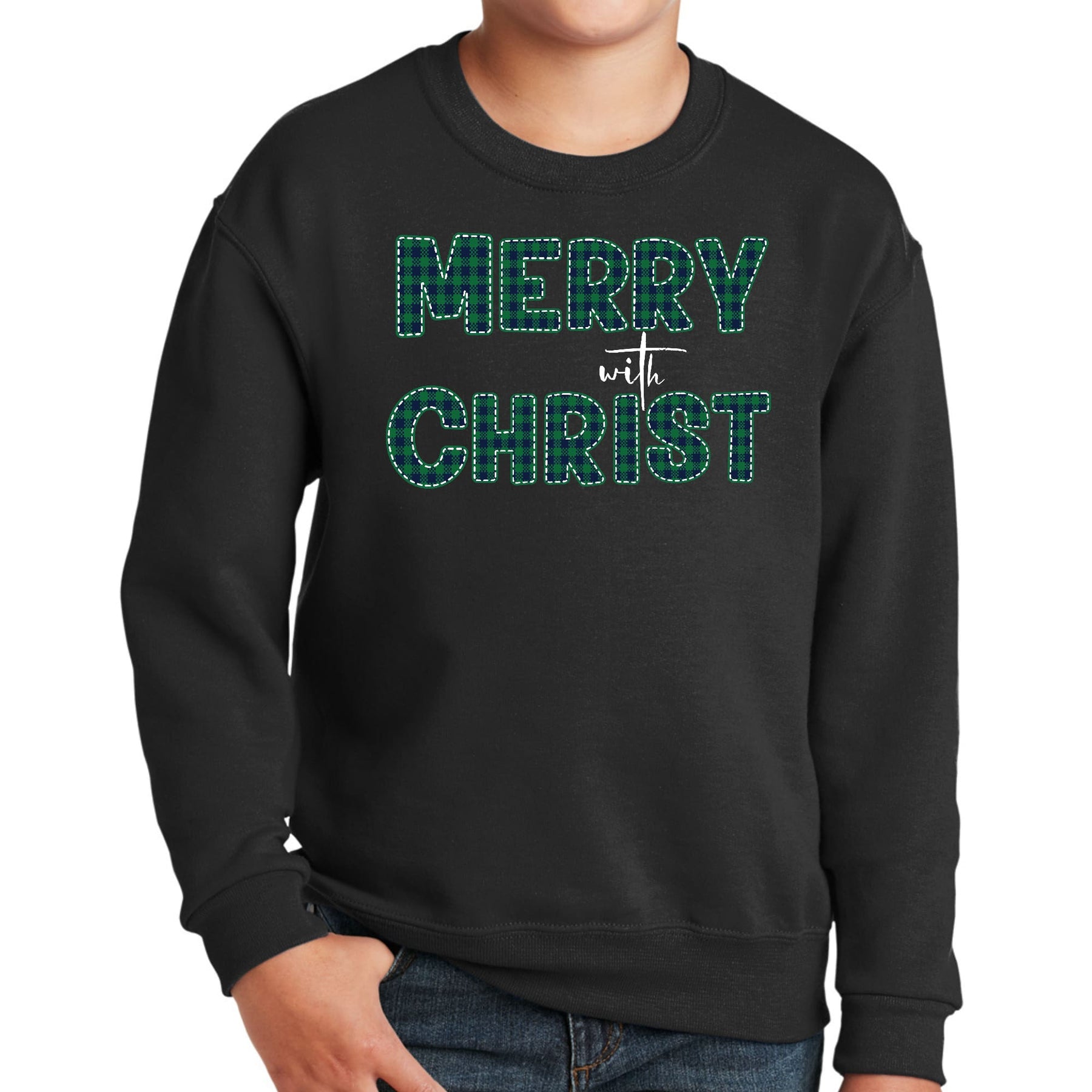 Youth Graphic Sweatshirt Merry With Christ, Green Plaid Christmas Holiday Pattern Print. This crewneck sweatshirt is durable, made to last, and is comfortable enough to wear all day.
