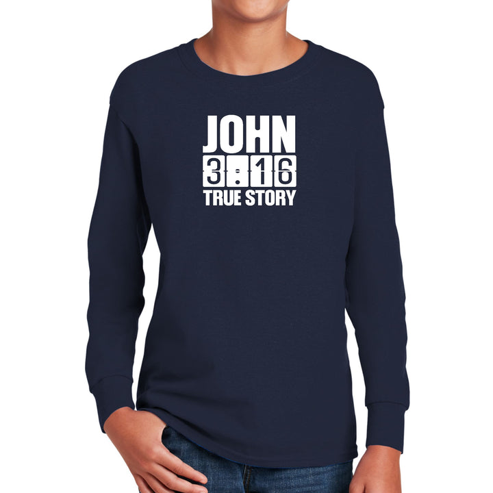 Youth Long Sleeve Graphic T-Shirt, John 3:16 True Story Print. Discover the versatility of our long sleeve youth tee. This unisex t-shirt is designed to be a go-to choice in all seasons.