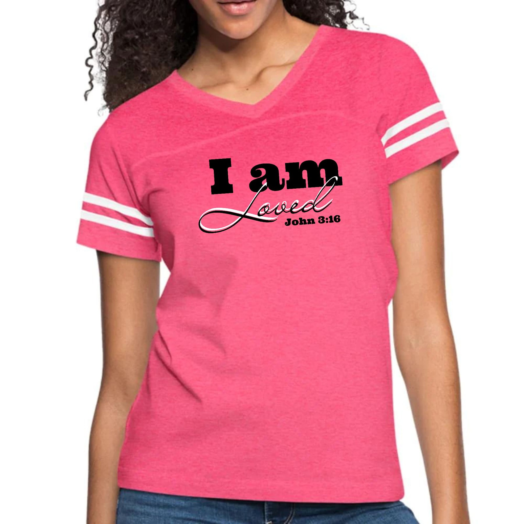 Womens Vintage Sport Graphic T-Shirt, I Am Loved - John 3:16 Black Illustration. Our women's sport tee is perfect for any activity, whether you're hitting the gym or just running errands. This shirt is made from a soft and stretchy cotton blend, this tee is sure to keep you comfortable all day long. Plus, the vintage-inspired design is sure to turn heads, whether you're working out or just lounging around. Available in a variety of colors and sizes, our women's sport tee is a must-have for any active woman.