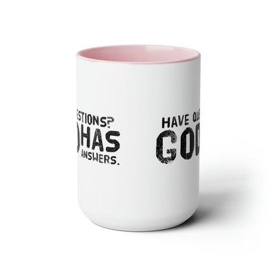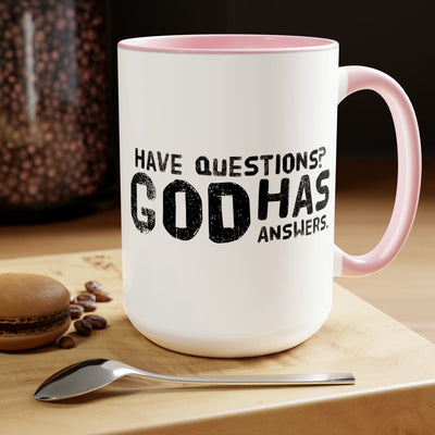Have Questions God Has Answers Black Illustration Ceramic Coffee Mug. Warm-up with a nice cuppa out of this two-tone accent ceramic coffee mug. This mug is perfect for your morning cup of coffee, tea, hot cocoa, or any other hot beverage. It's also great for cold beverages! The ceramic mug is microwave and dishwasher safe. It’s BPA and Lead-free, and made of durable ceramic in 15-ounce size.