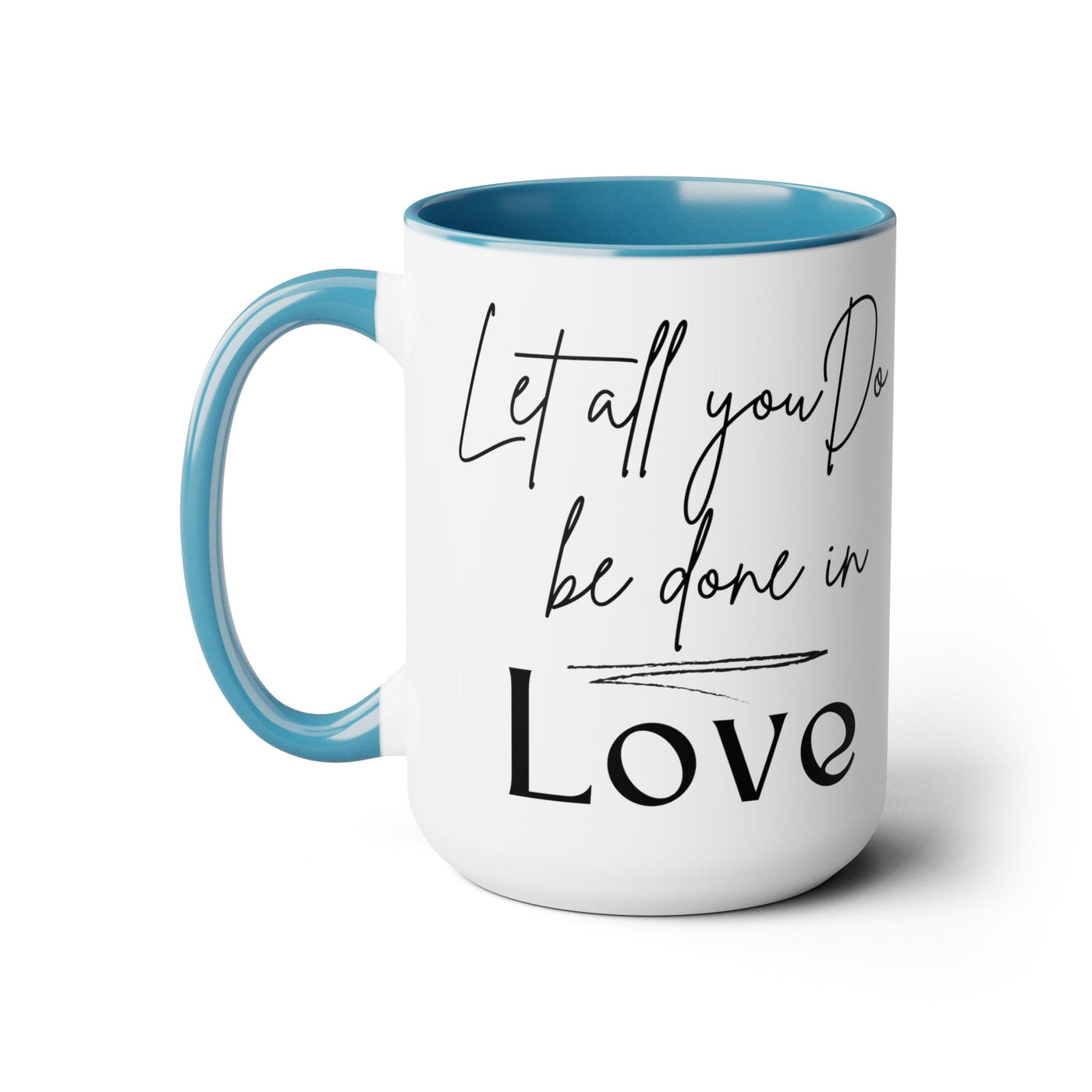 Let All You Do Be Done In Love Black Illustration Ceramic Coffee Mug. Warm-up with a nice cuppa out of this two-tone accent ceramic coffee mug. This mug is perfect for your morning cup of coffee, tea, hot cocoa, or any other hot beverage. It's also great for cold beverages! The ceramic mug is microwave and dishwasher safe. It’s BPA and Lead-free, and made of durable ceramic in 15-ounce size.