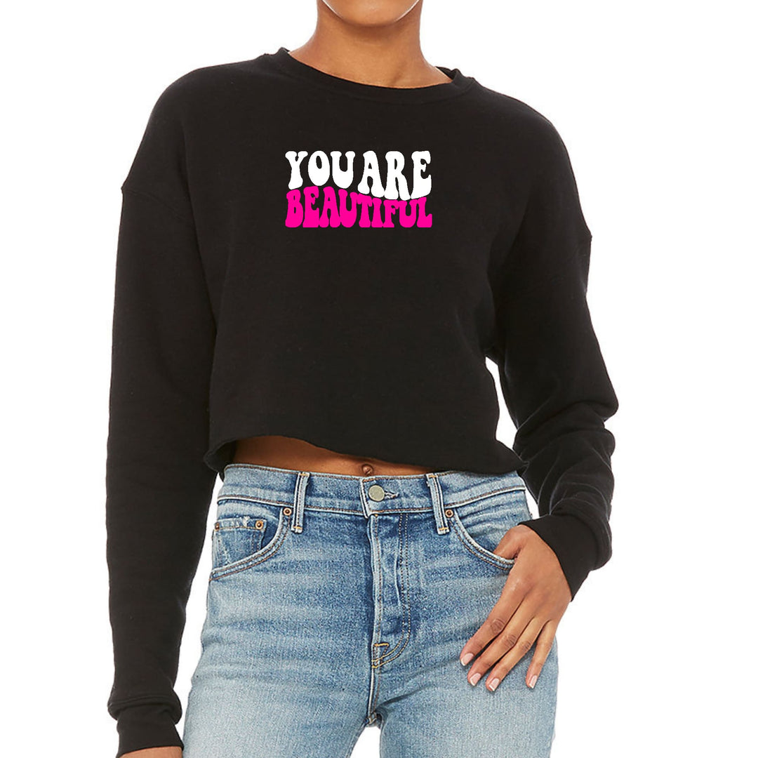 Womens Cropped Graphic Sweatshirt, You Are Beautiful Pink White Affirmation Illustration. This crewneck sweatshirt exudes classic appeal with its comfortable pullover style and cozy fleece construction. Crafted from affordable cotton, this versatile crewneck offers a stylish sweatshirt design. The quality fabric ensures everyday casual comfort, making it a trendy and timeless option for daily wear. The soft-blend fleece design adds an extra layer of coziness, while the affordable price makes it an accessible choice for everyone. Whether you prefer a classic pullover sweatshirt or a versatile crewneck option, this sweatshirt caters to a variety of preferences, providing a staple for your wardrobe in a variety of colors. Suitable for everyone, this sweatshirt is the epitome of affordable and stylish everyday comfort.